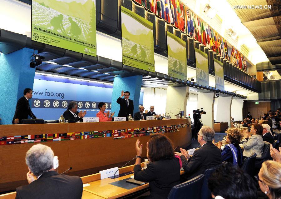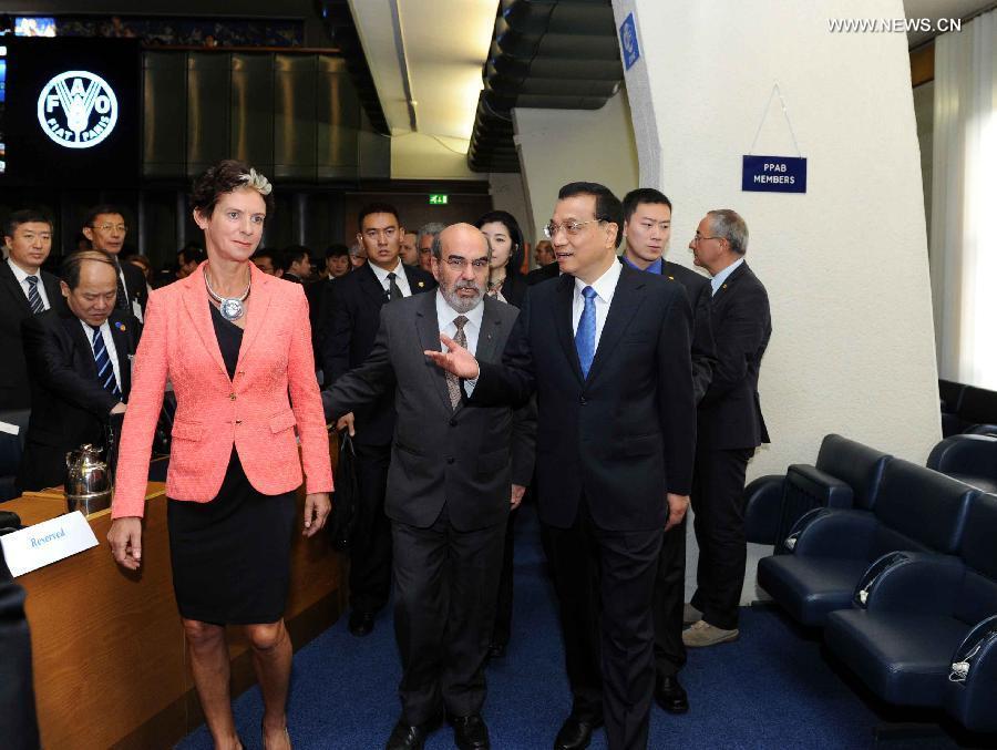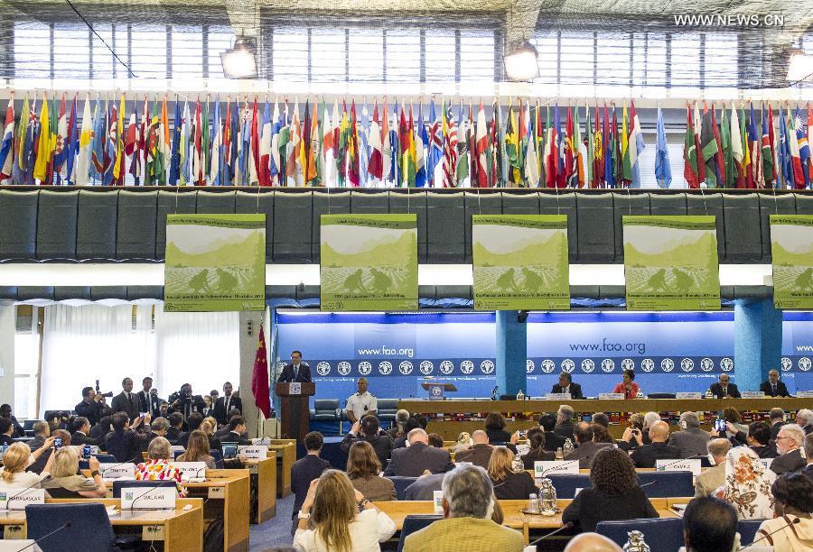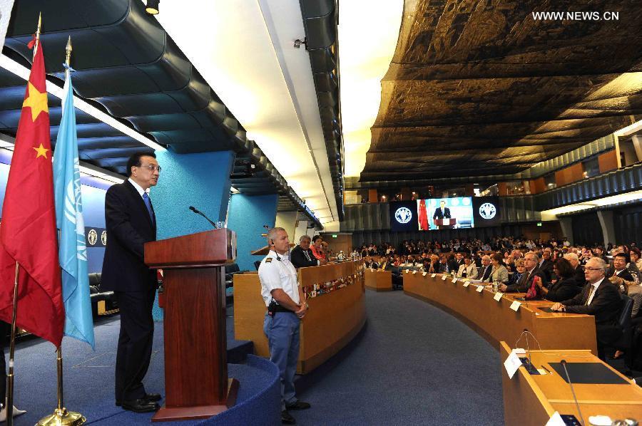 Chinese Premier Li Keqiang (L) gives a speech at the headquarters of the UN Food and Agriculture Organization (FAO), in Rome, Italy, Oct. 15, 2014. (Xinhua/Wang Ye)