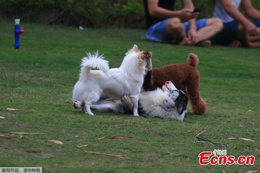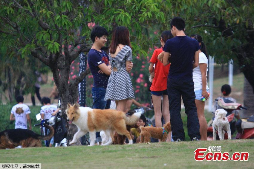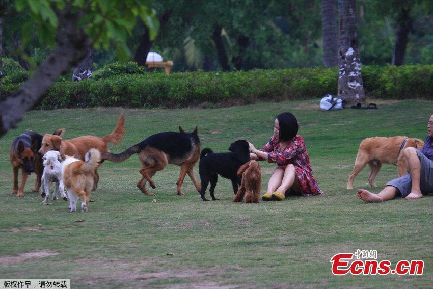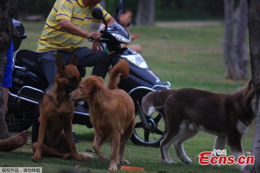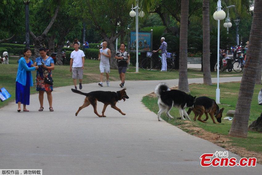 Dog owners walk their pets without a leash in Bailu Park of Sanya, Hainan province on Wednesday evening, October 15, 2014. Those unleashed dogs provoked safety concerns among local residents. [Photo/ CFP]