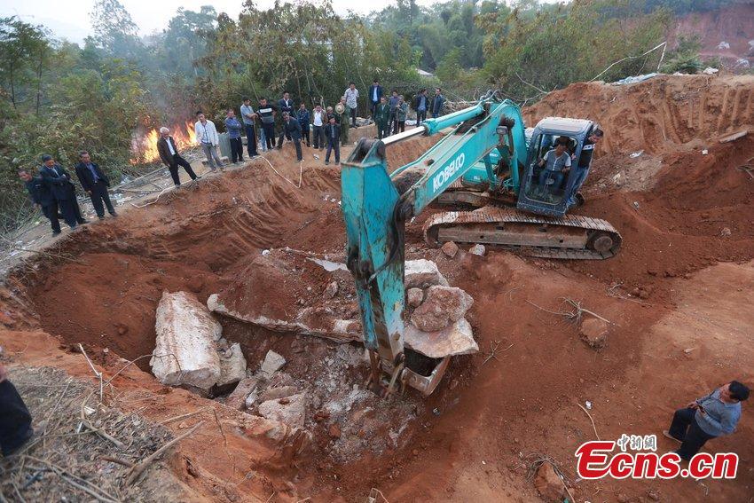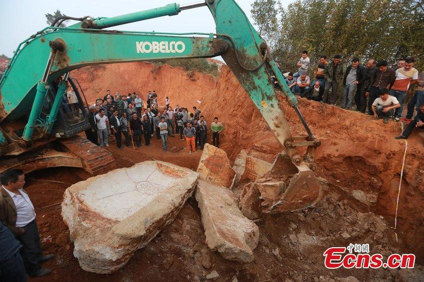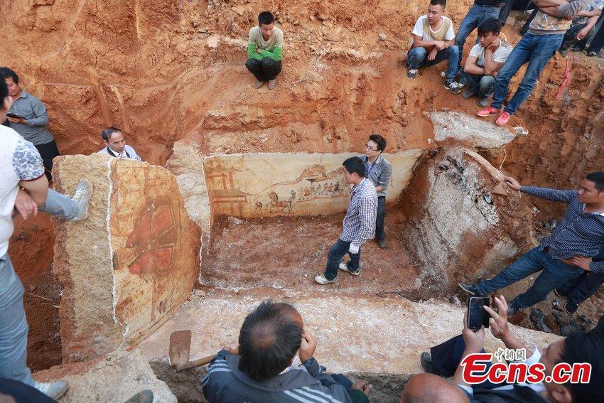 Archaeologists check a fresco inside an ancient tomb of Ming Dynasty (1368–1644) unearthed at a construction site in Loudi, Central China’s Hunan province on October 14, 2014. It was the first time that a luridly-colored fresco was found in the city, said local experts. [Photo/ CFP]