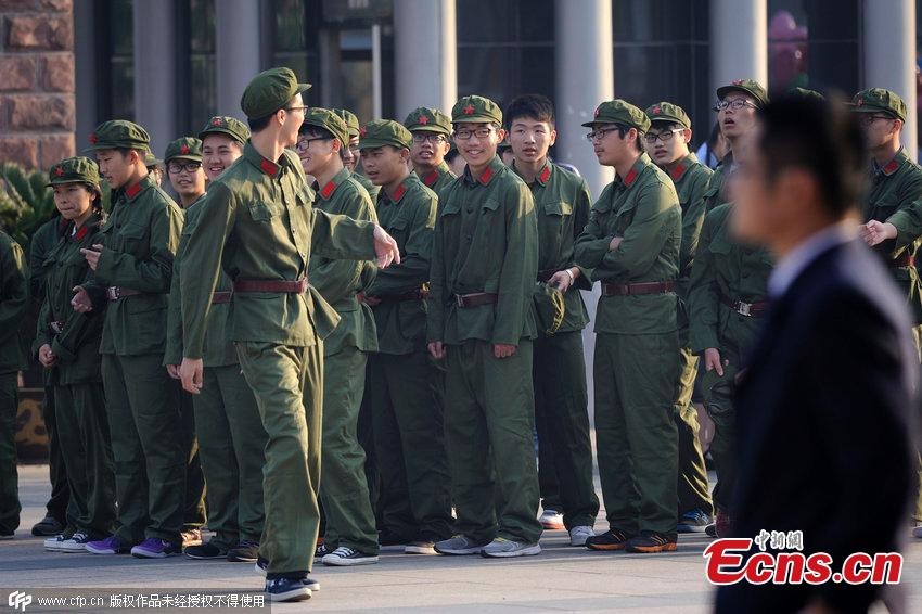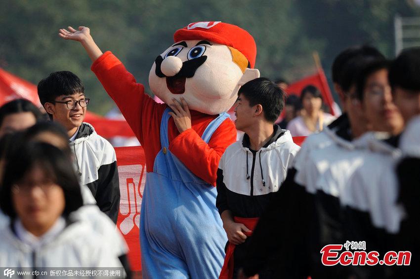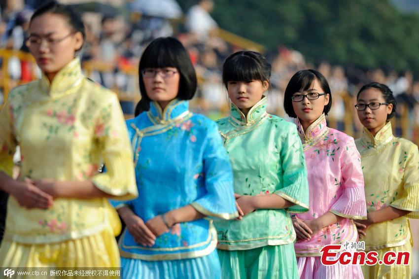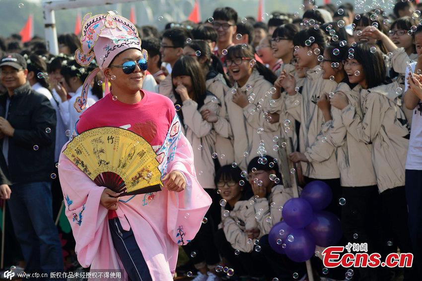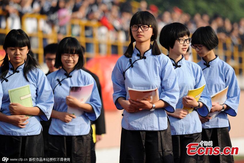 A student wears historical costumes at the opening ceremony of a high school’s sports meet in Jiaxing, Zhejiang province on Oct 16, 2014. [Photo/CFP]