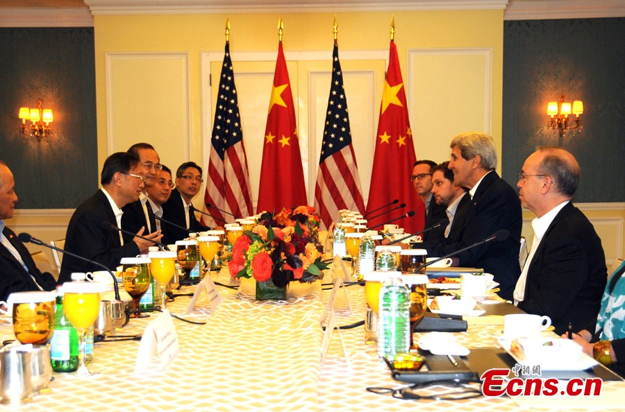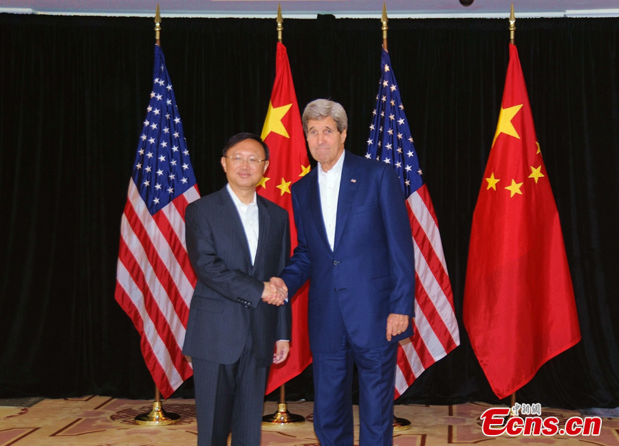 Chinese State Councillor Yang Jiechi (L) and US Secretary of State John Kerry shake hands as they arrive for a meeting in Boston, Massachusetts, the United States, Oct 18, 2014. The two said they will be discussing issues such as the US-China relations, the upcoming APEC summit in Beijing and Ebola. (Photo: China News Service/Diao Haiyang)
