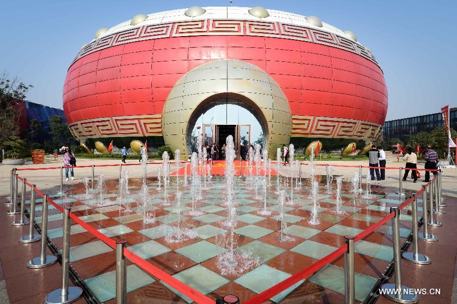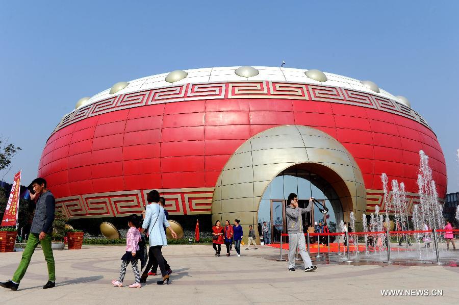 Photo taken on Oct 18, 2014 shows the drum-shaped building in Hefei, capital of east China's Anhui Province. Measuring 18.13 meters in height with a diameter of 58.52 meters at its widest point, the building was granted the Guinness World Record of the largest building in the shape of a drum. (Xinhua/Zhang Duan)