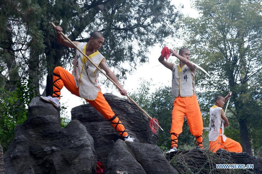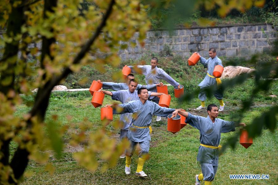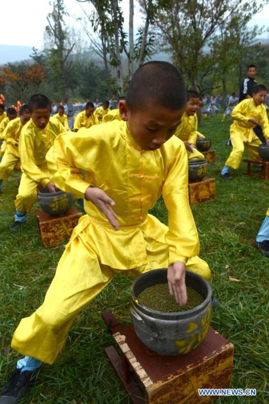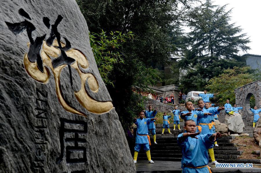 Students of a kungfu school show kungfu during the welcoming ceremony of the 10th Zhengzhou International Shaolin Wushu Festival in Dengfeng, central China's Henan province, Oct 19, 2014. More than 1,800 kungfu practitioners from 63 countries and regions will participate in the three-day festival, opened on Sunday. (Xinhua/Zhu Xiang)