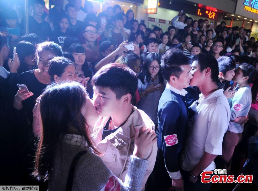 About 40 couples compete by kissing in various poses during a promotion campaign launched by a shopping mall in Jinhua, Zhejiang province on October 18, 2014. An iPhone 6 was presented to the winning couple in the event. [Photo/ CFP]