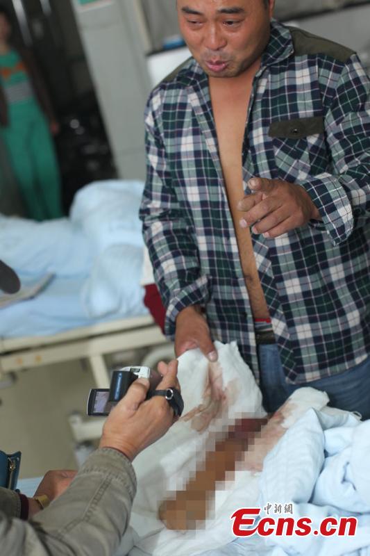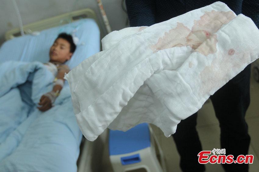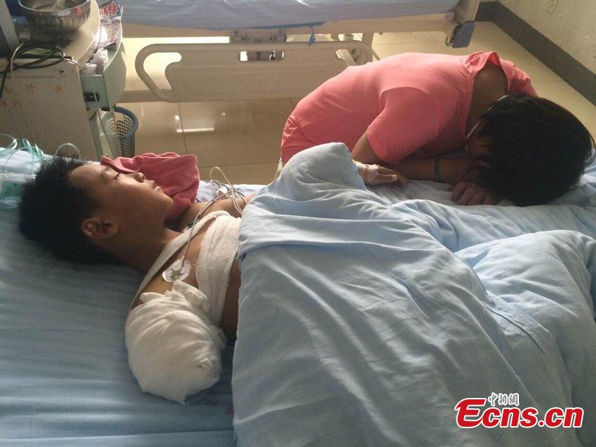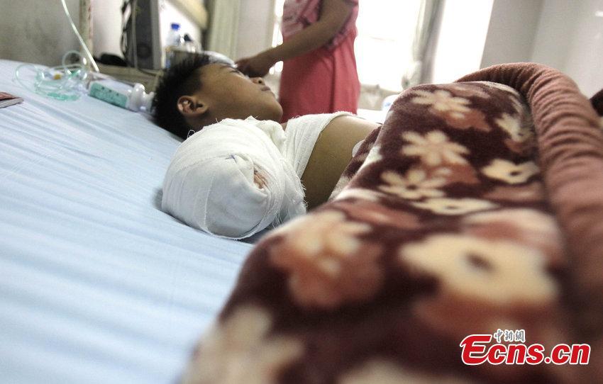 A nine-year-old boy whose right arm was bitten off by a bear at a zoo is in hospital of Henan province after amputation on Oct 19, 2014. The tragedy happened when the boy attempted to feed the bear through its cage at the zoo Saturday. [Photo: CFP]