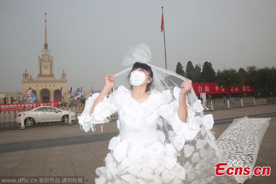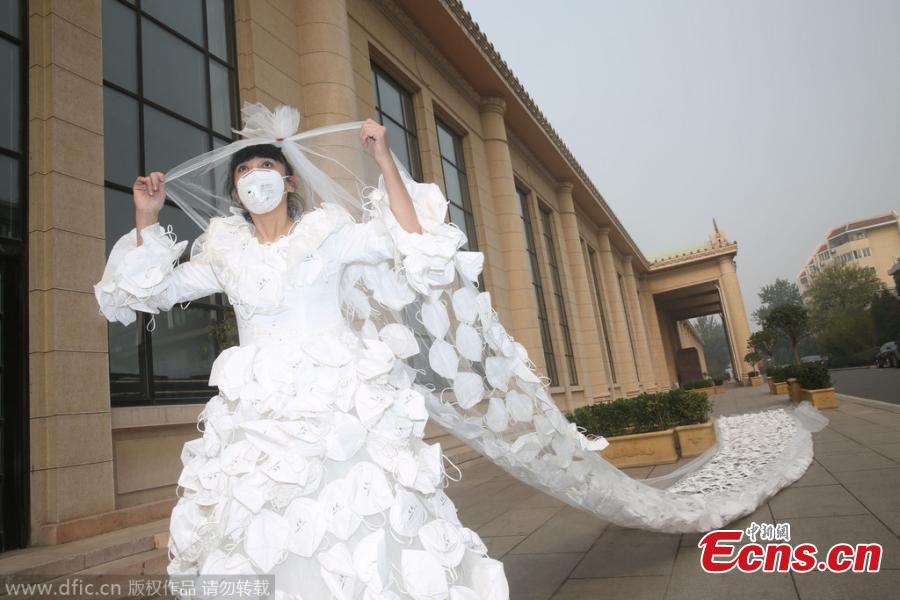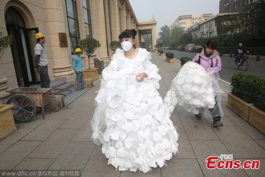 In a wedding dress made with a total of 999 anti-smog masks, a girl stages her performance art show on a street near the Beijing Exhibition Center in Beijing on Monday, October 20, 2014. The artist named Kong Ning played the role of “smog girl” who married "blue sky" in the show. [Photo/ IC]