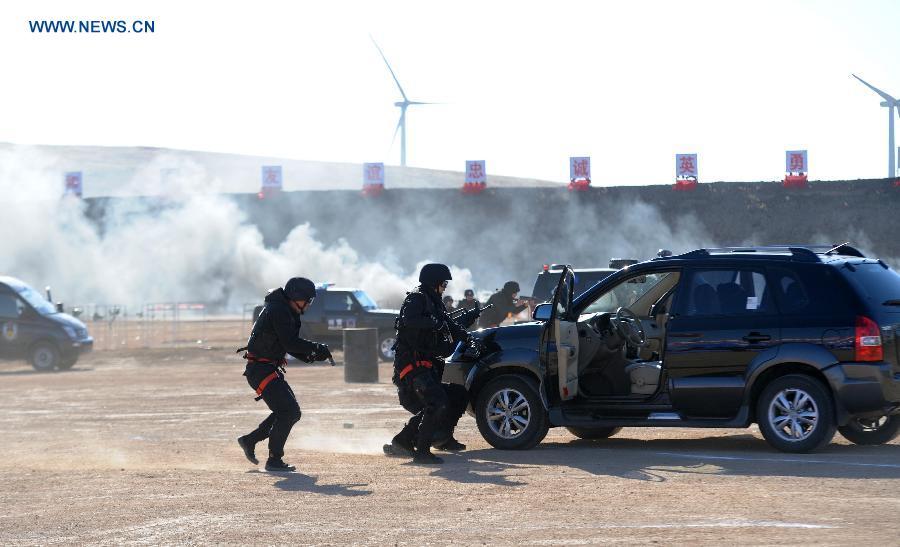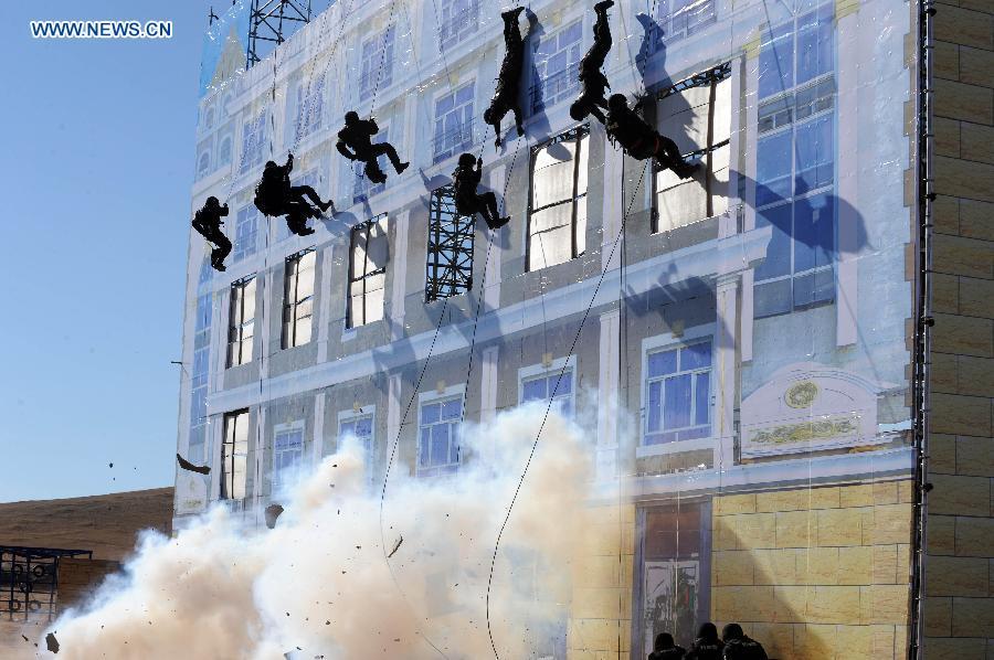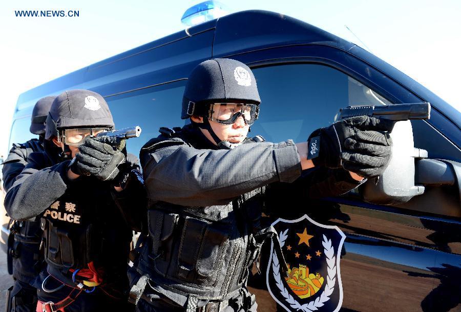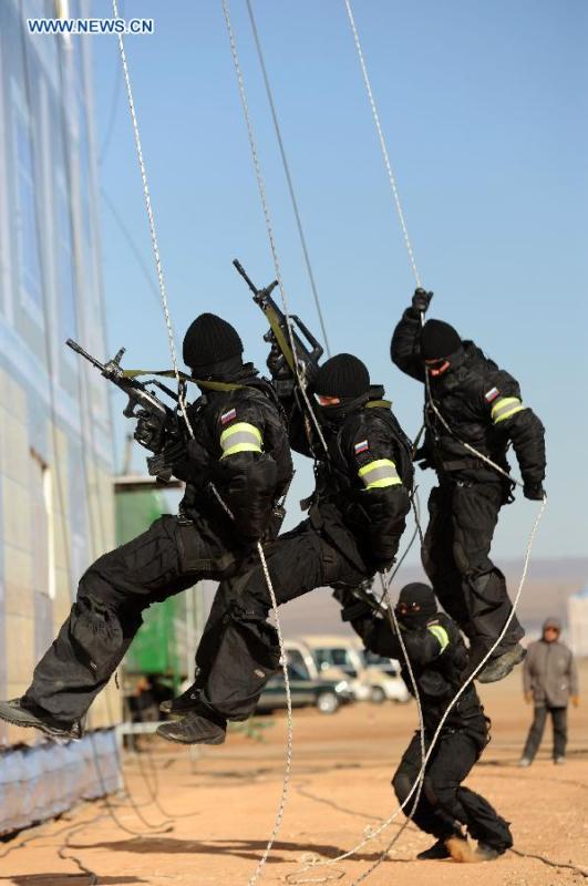 Chinese and Russian policemen attend a joint anti-terror drill in Manzhouli City, north China's Inner Mongolia Autonomous Region, Oct 20, 2014. In order to boost coordinated ability to fight terrorism in the border region, Chinese and Russian police held a anti-terror drill on Monday, which involves planning hostage rescues and physical competitions between both squads. (Xinhua/Zhang Ling)