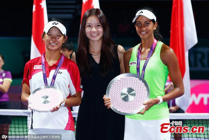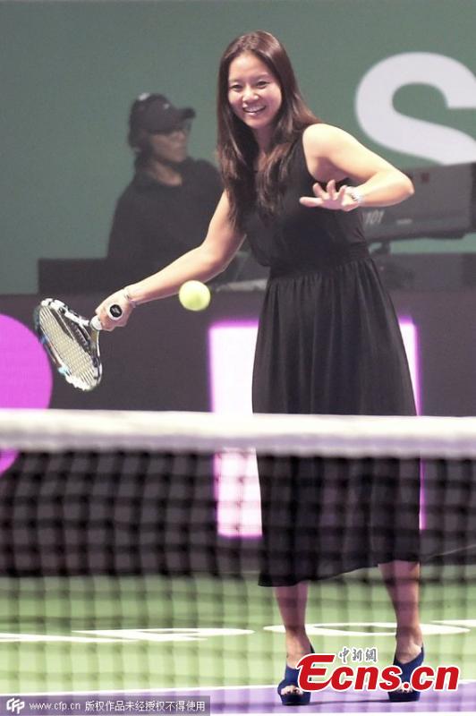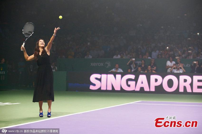 Retired Chinese star Li Na, wearing high heels and a black evening dress, opens the WTA Finals in Singapore with a ceremonial first serve on Oct 20, 2014. [Photo/CFP]