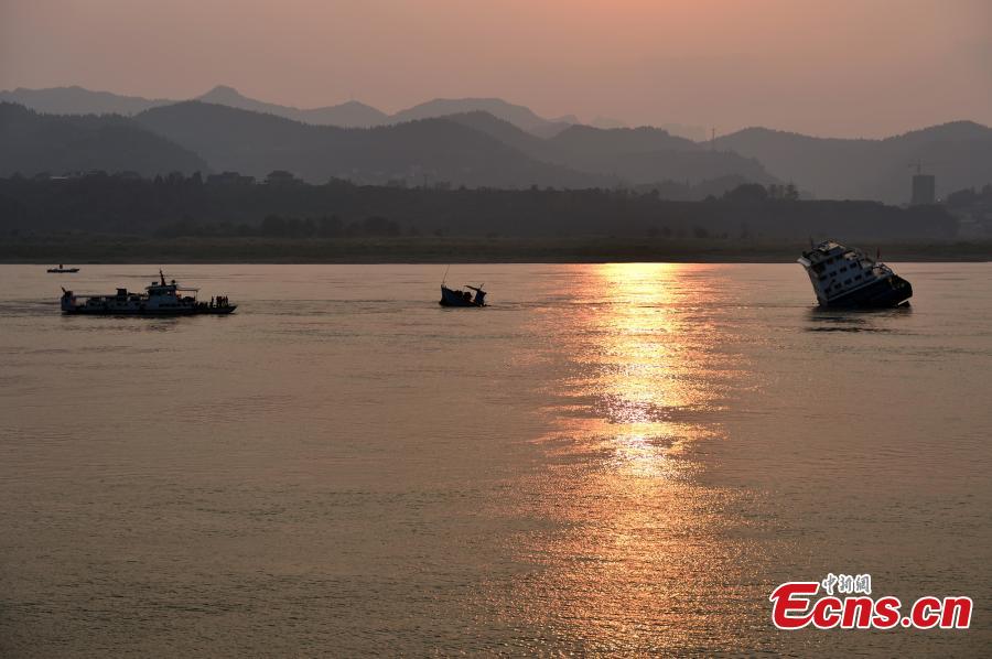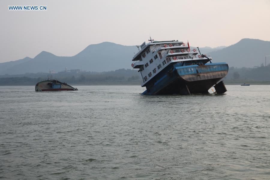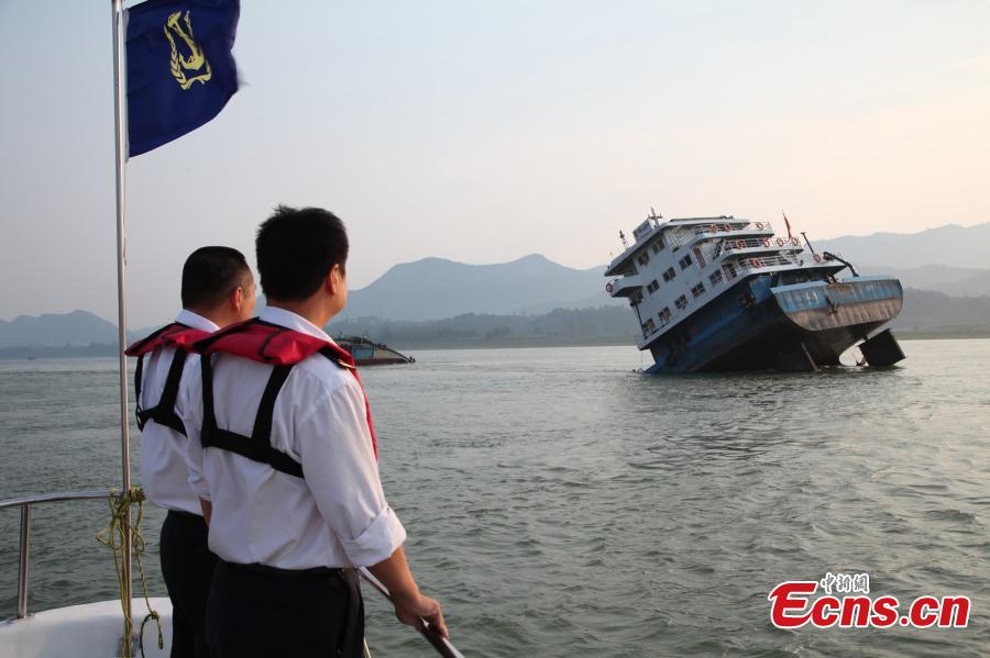 A cargo ship carrying ore sinks in the Yangtze River in Yichang, central China's Hubei province, Oct 21, 2014. The ten crew members on the ship were all rescued after the sinking. (Xinhua/Li Lin)