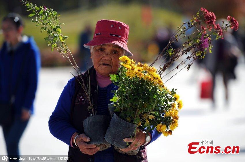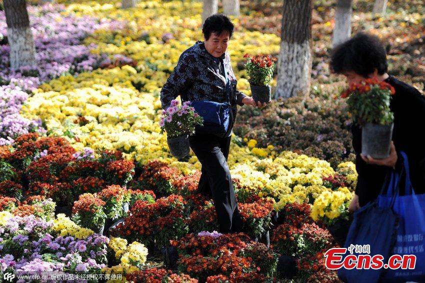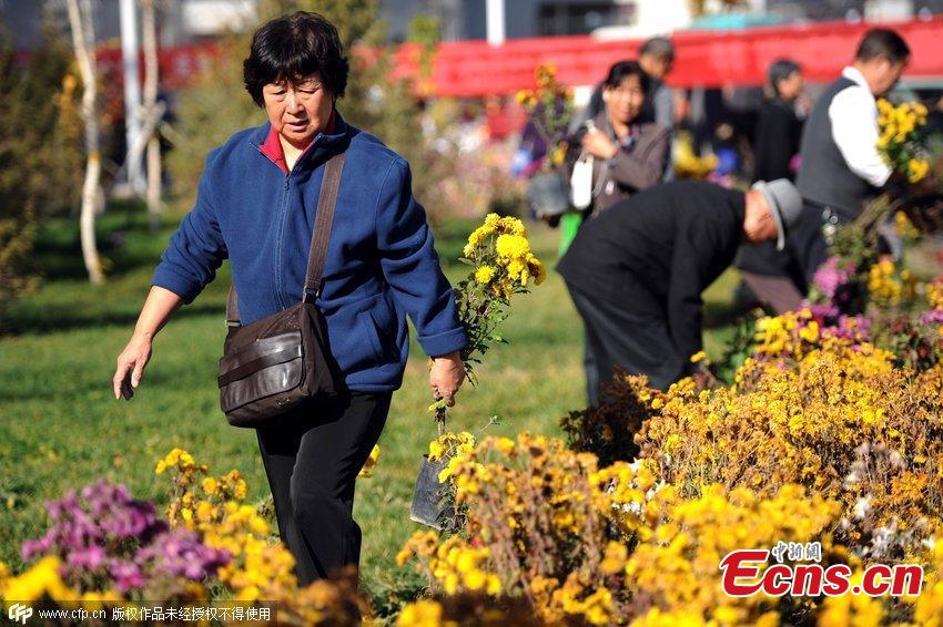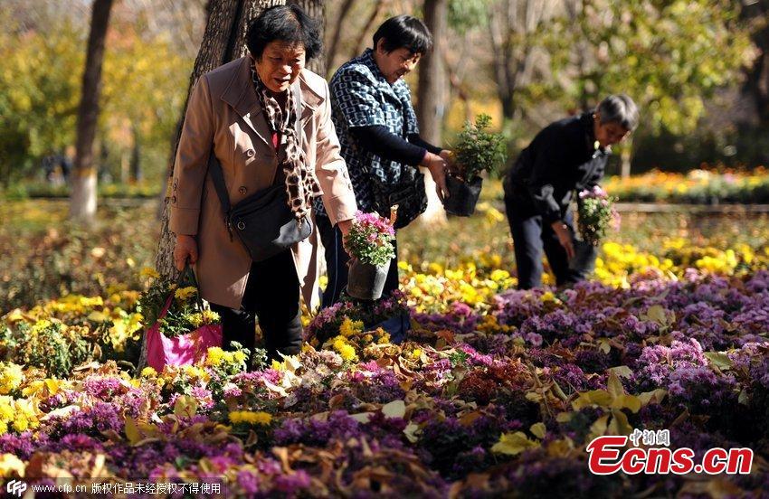 People choose free potted-chrysanthemums from a botanic garden of Urumqi, Northwest China's Xinjiang Uygur Autonomous Region on October 21, 2014. A total of 230,000 potted flowers worth over three million yuan ($490,204) were distributed to local residents for free. [Photo/ CFP]