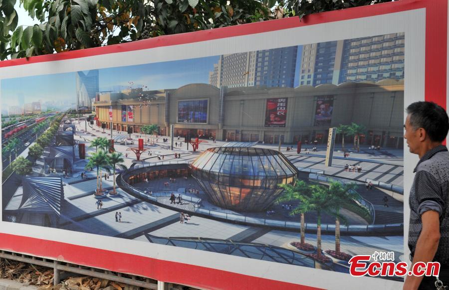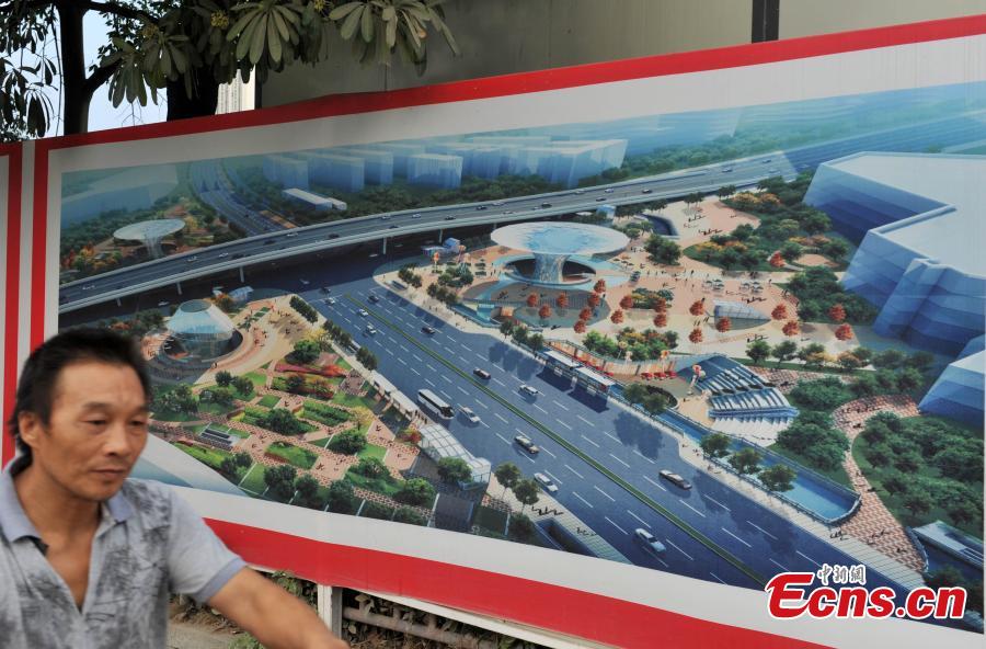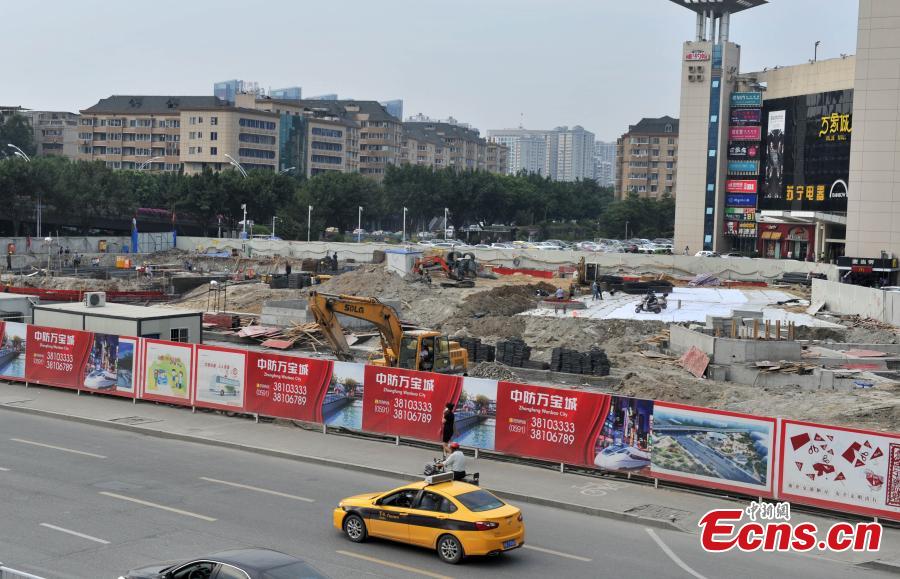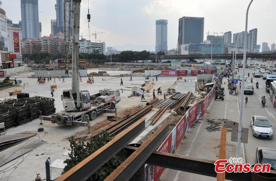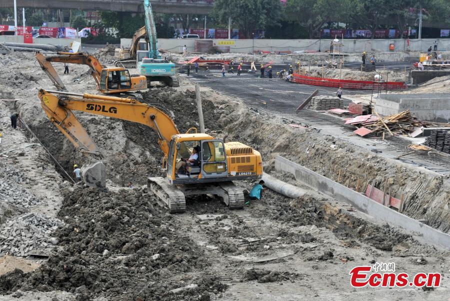 Photo taken on October 21, 2014 shows the construction site of a large scale civil air defense shelter in Fuzhou, Fujian province. The shelter will be the first one that for both peacetime and wartime use in China after being constructed. Covering an area of 195,000 square meters, the structure will feature a combination of facilities including underpasses, subway stations, shopping centers, a garage, and a sunken plaza. Construction of the project will be completed in May of 2016. [Photo: China News Service/ Lv Ming]