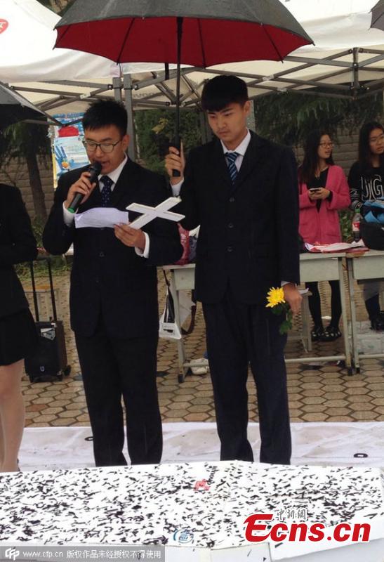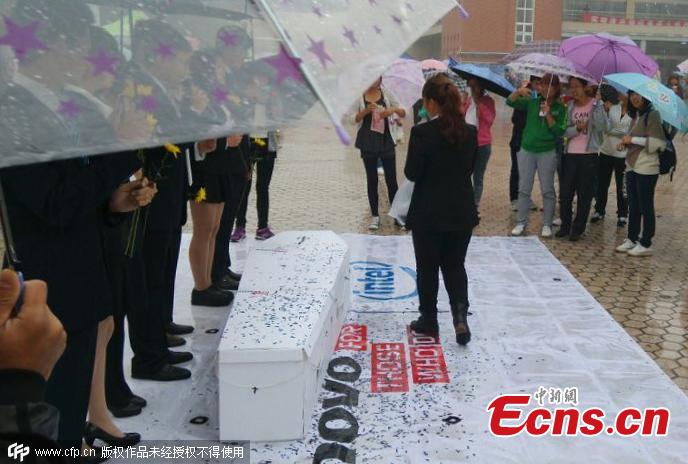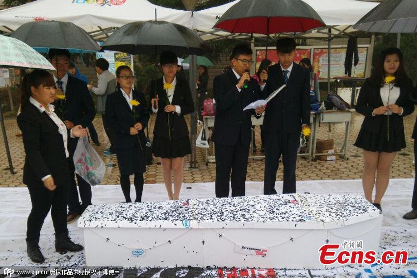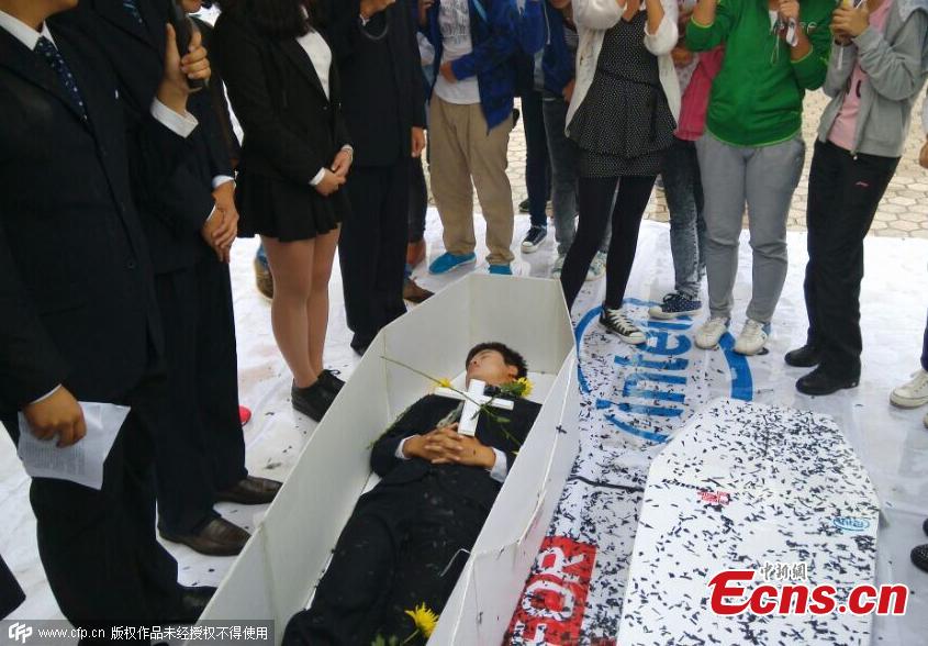 A student lies in a paper coffin with some others standing beside at a pseudo-funeral in a university of Henan province on October 20, 2014. A performance art piece was staged on Monday in the university to warn college students not to become slaves of internet. [Photo/CFP]
