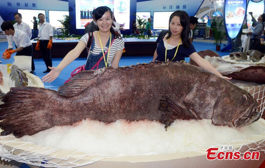 Two girls pose for photos with a 210 kg grouper shown at an international fishery expo in Fuzhou, Fujian province on Thursday, October 23, 2014. [Photo: China News Service/ Liu Kegeng]