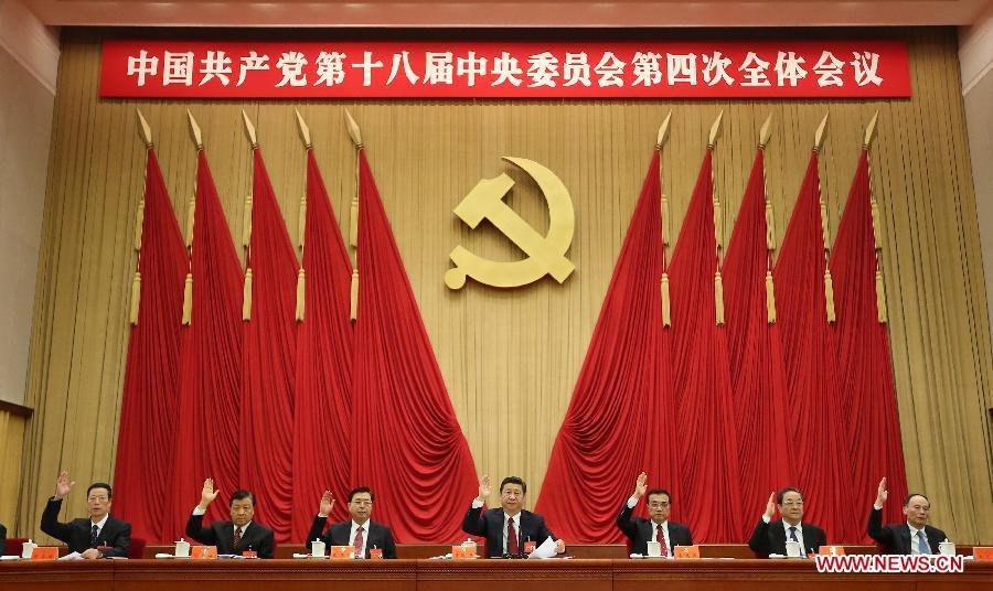 Chinese leaders Xi Jinping, Li Keqiang, Zhang Dejiang, Yu Zhengsheng, Liu Yunshan, Wang Qishan and Zhang Gaoli attend the Fourth Plenary Session of the 18th Central Committee of the Communist Party of China (CPC) in Beijing, capital of China. The session was held here from Oct 20 to 23. (Xinhua/Lan Hongguang)