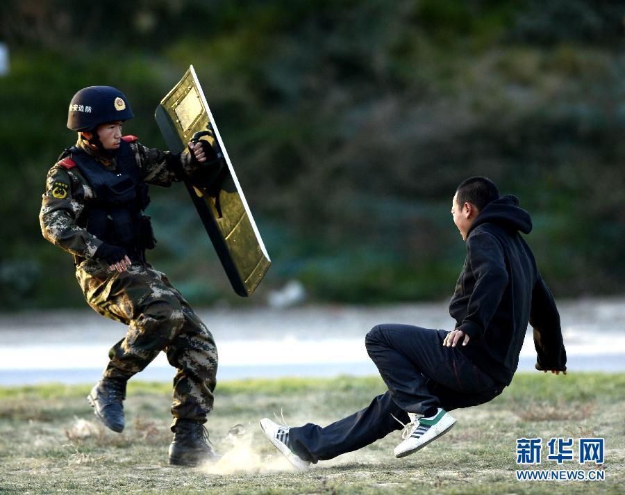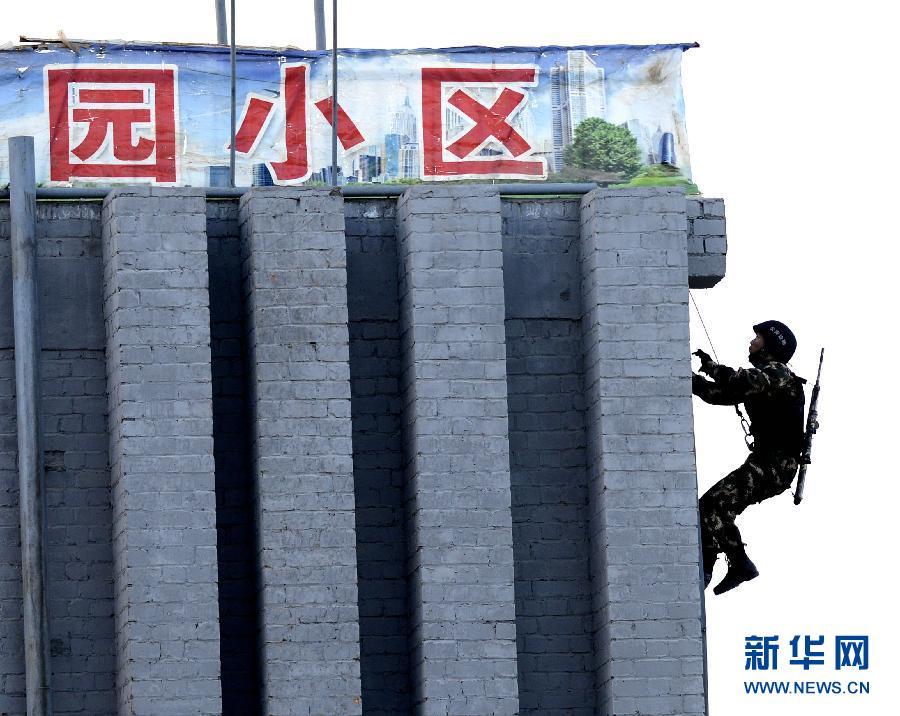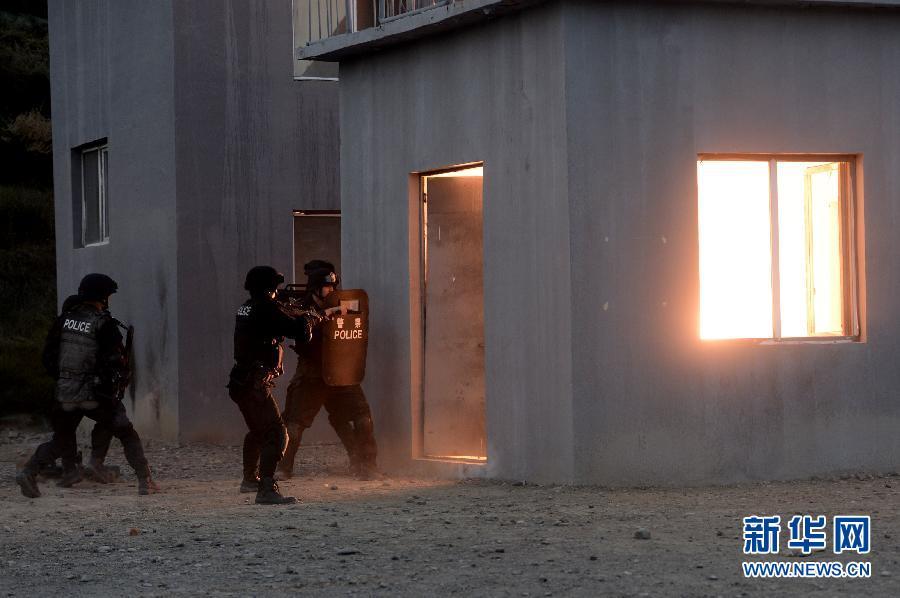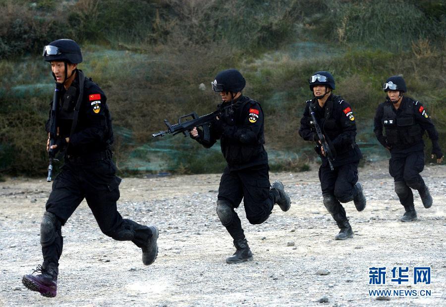To boost coordinated ability to fight terrorism in the border region, members of armed police force take part in joint anti-terror drills in northwest China's Xinjiang Uygur autonomous region on Oct 22, 2014.. (Xinhua News Agency/Zhao Ge)