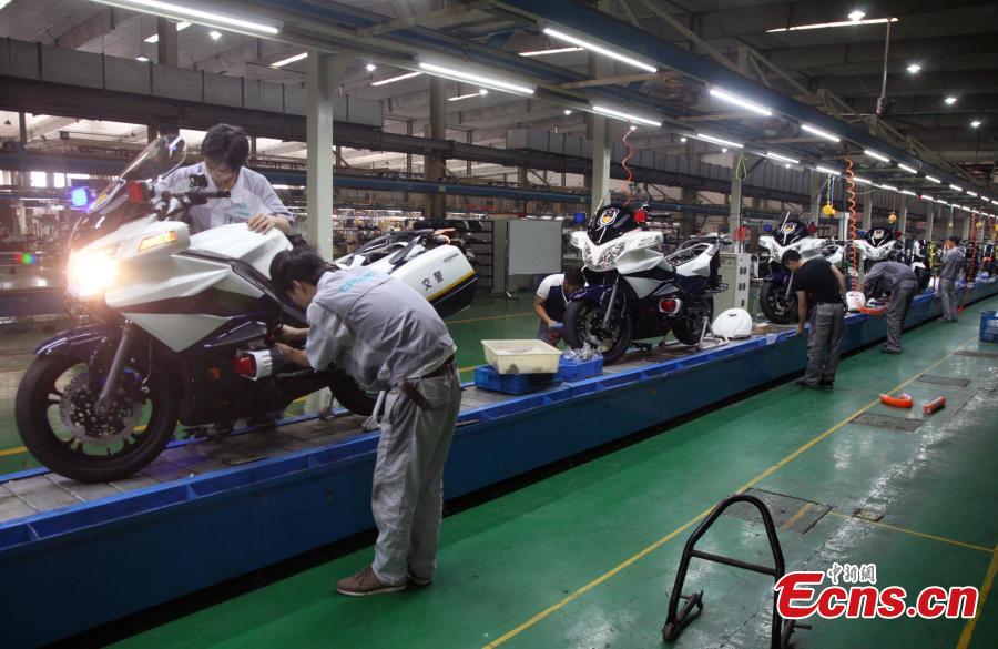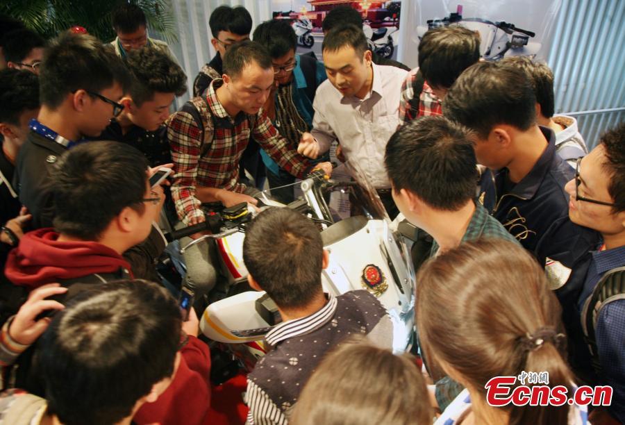 Visitors are attracted by an escort motorcycle shown at a plant of the vehicle’s manufacture in Hangzhou, Zhejiang province on Thursday, October 23, 2014. The producer announced it would launch a civilian version of the motorcycle in 2015. China on Tuesday resumed motorcycle escorts for visiting foreign leaders, including them in the motorcade of Tanzanian President Jakaya Mrisho Kikwete as he travelled from the airport to the Diaoyutai State Guesthouse in central Beijing. The country had conducted motorcycle escorts since the founding of the People's Republic of China in 1949, but stopped the practice on Jan. 1, 2004. [Photo: China News Service/ Li Chenyun]