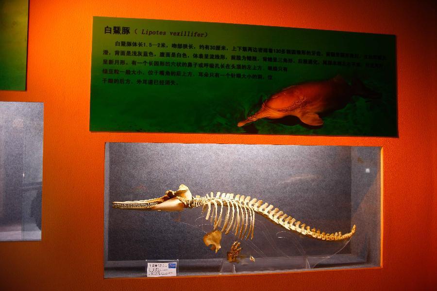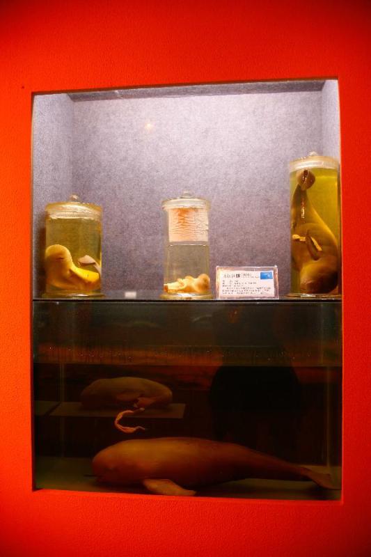 Photo taken on Oct 22, 2014 shows the samples of finless porpoise in a museum in the Tongling National Nature Reserve for Freshwater Dolphins in Tongling City, east China's Anhui province. Friday coincided with the International Freshwater Dolphin Day. The day set in 2010 for the preservation of the freshwater mammal was also claimed by the World Wide Fund for Nature (WWF) as a sad reminder of the recently lost Yangtze white-finned dolphin, known in Chinese as Baiji Dolphin, which is bigger than the finless porpoise. As the Yangtze, the longest river in China, has been turned into a busy shipping waterway and a hydrological power source for hundreds of reservoirs, animal activists warned the finless porpoises may die out within 10 to 15 years, if tough measures are not taken. There are only about 1,040 finless porpoises in the Yangtze and two lakes linked to the waterway, according to a survey in 2012 by the Ministry of Agriculture, the Chinese Academy of Sciences (CAS) and WWF. However, they are considered "functionally extinct", because water dams and shipping have blocked their travel and the population is too small for the species to reproduce. On Oct 14, the Ministry of Agriculture issued a Yangtze finless porpoise protection notice urging local authorities to implement the most restrictive protection measures possible for the finless dolphin. Sources with the agriculture authorities said rescuers are expected to displace dolphins to safe havens whenever the mammal is found and rescued in the wild. (Xinhua/Zhu Weixi)