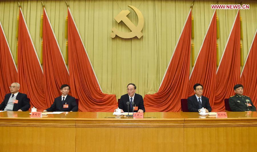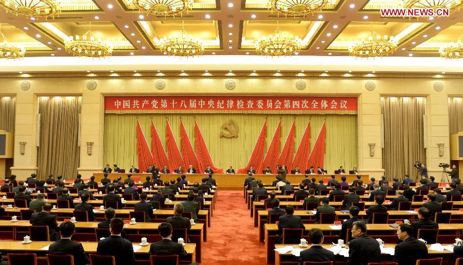 Wang Qishan (C), a member of the Standing Committee of the Political Bureau of the Communist Party of China (CPC) Central Committee and secretary of the CPC Central Commission for Discipline Inspection (CCDI), speaks during the fourth plenary session of the 18th CCDI of the CPC in Beijing, capital of China, Oct. 25, 2014. (Xinhua/Ma Zhancheng)