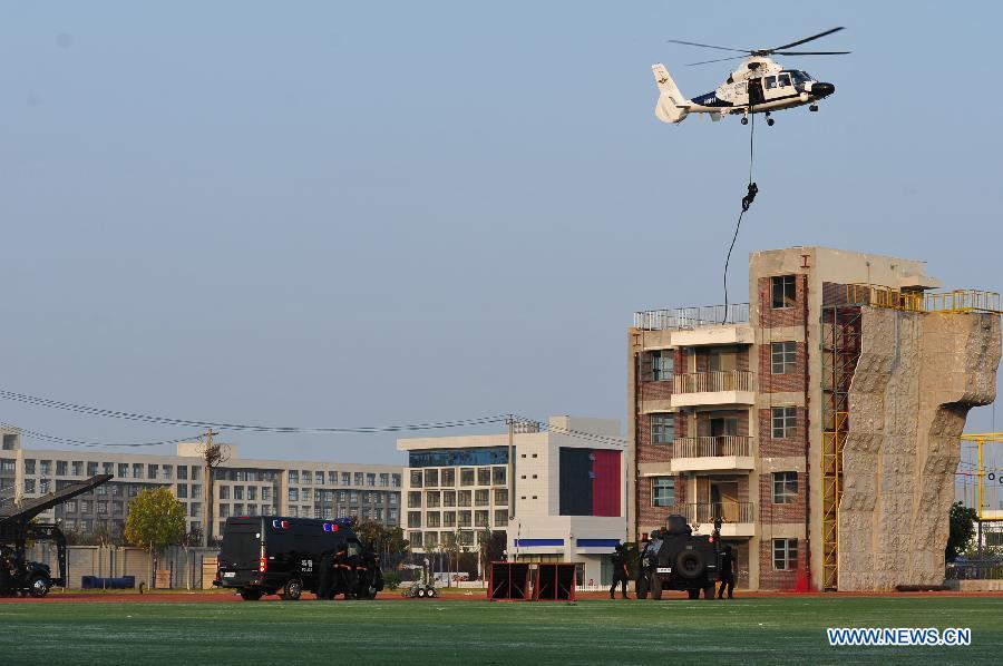 Policemen attend an anti-terror drill in Hefei, capital of east China's Anhui province, Oct 26, 2014. (Xinhua/Du Yu)