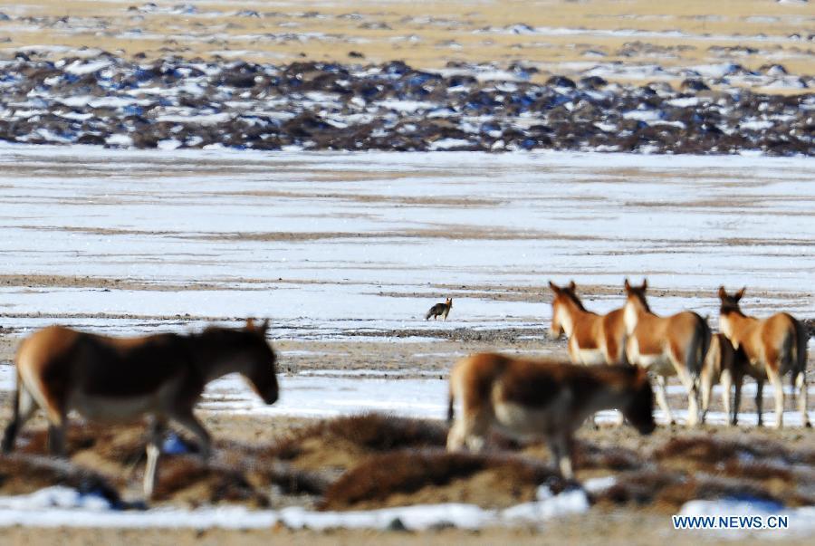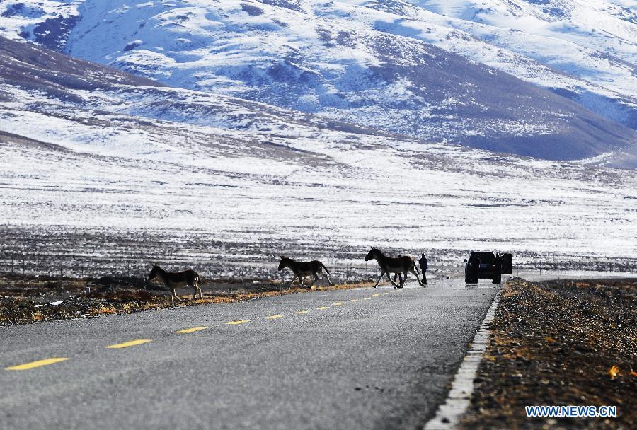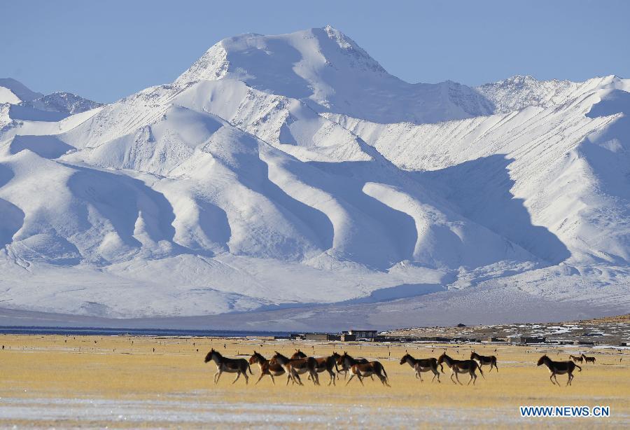 A herd of kiangs (Equus kiang) run past a village at the foot of a snow mountain in Burang County of Ali Prefecture in southwest China's Tibet Autonomous Region, Oct 23, 2014. The wildlife population in Ali Prefecture has grown as China makes increasing efforts to curb illegal hunting in the country's natural reserves. Ali Prefecture, which is among the most remote areas in Tibet Autonomous Region, is home to 19 rare and endangered species including the Tibetan antelope and the snow leopard. (Xinhua/Wen Tao)