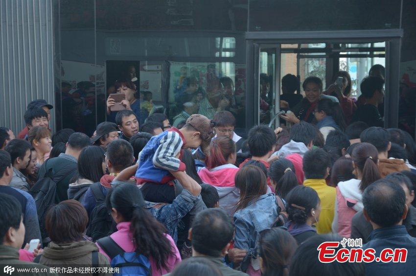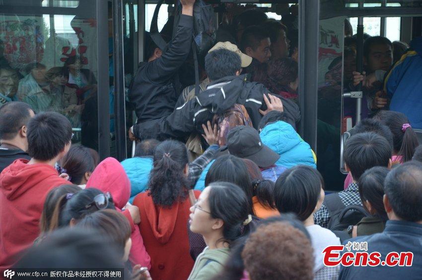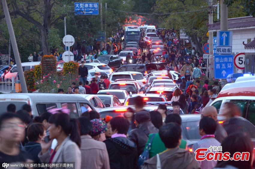 Traffic chaos is caused on the roads outside Beijing’s Fragrant Hills (Xiangshan) Park when a large number of tourists leave it in the afternoon on October 26, 2014. The day saw the coming of the first peak weekend for appreciating red leaves at the park. By 6:30 pm, more than 60,000 tourists have entered the park. [Photo/CFP]