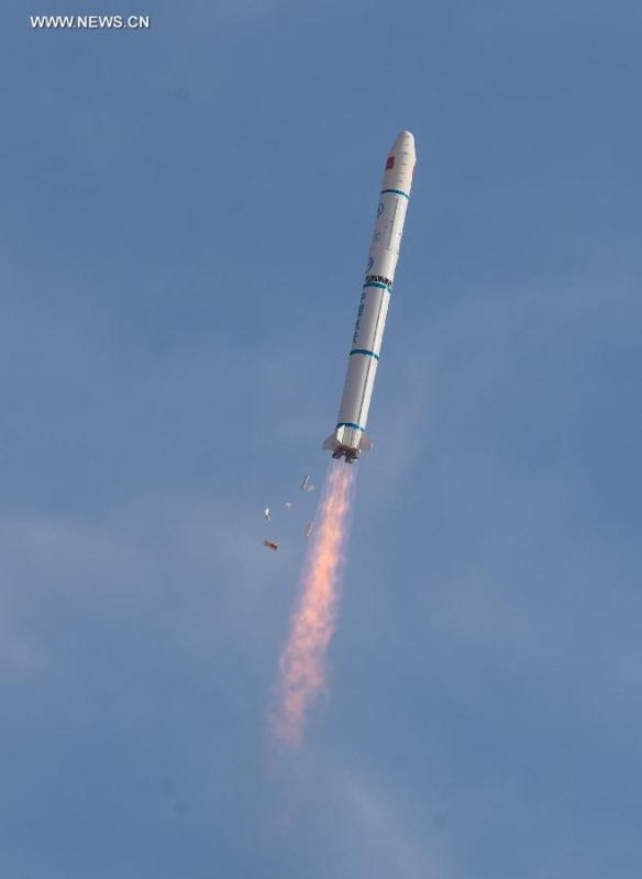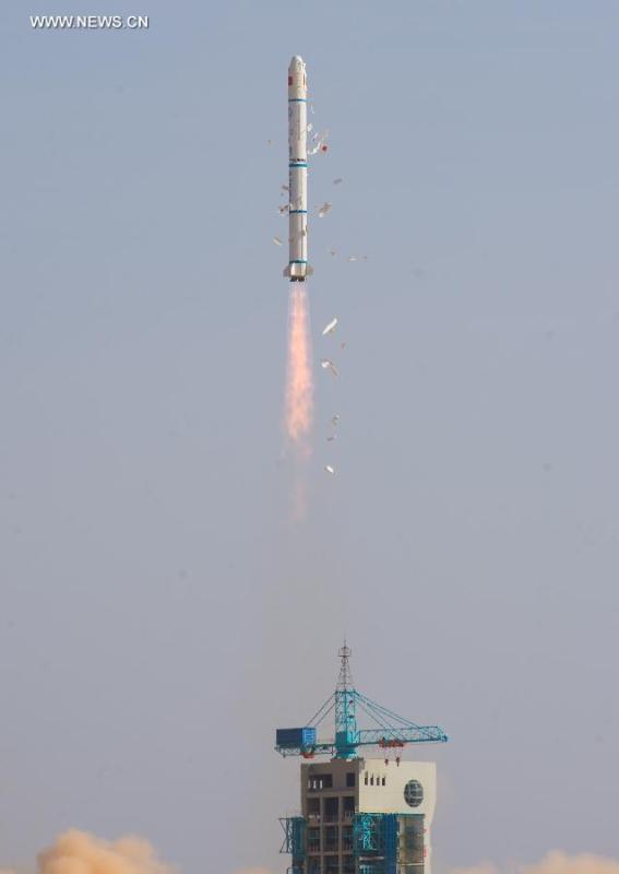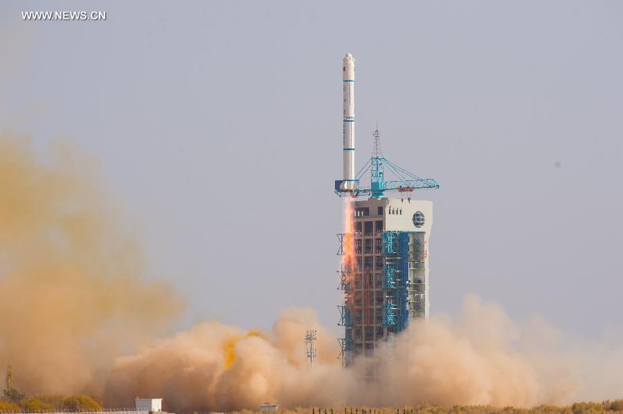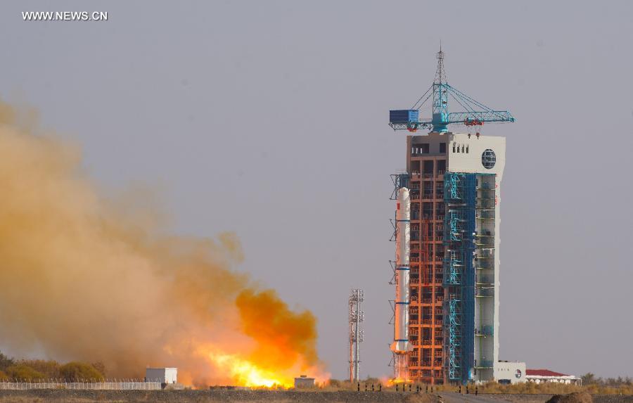A Long March 2C carrier rocket carrying the Shijian-11-08 experimental satellite leaves the launch pad at the Jiuquan Satellite Launch Center in Jiuquan, northwest China's Gansu province, Oct 27, 2014. The Shijian-11-08 satellite, which was launched from Jiuquan at 2:59 pm Monday, will be used to conduct scientific experiments in space. The launch marks the 197th flight of the Long March rocket series. (Xinhua/Li Xiang)