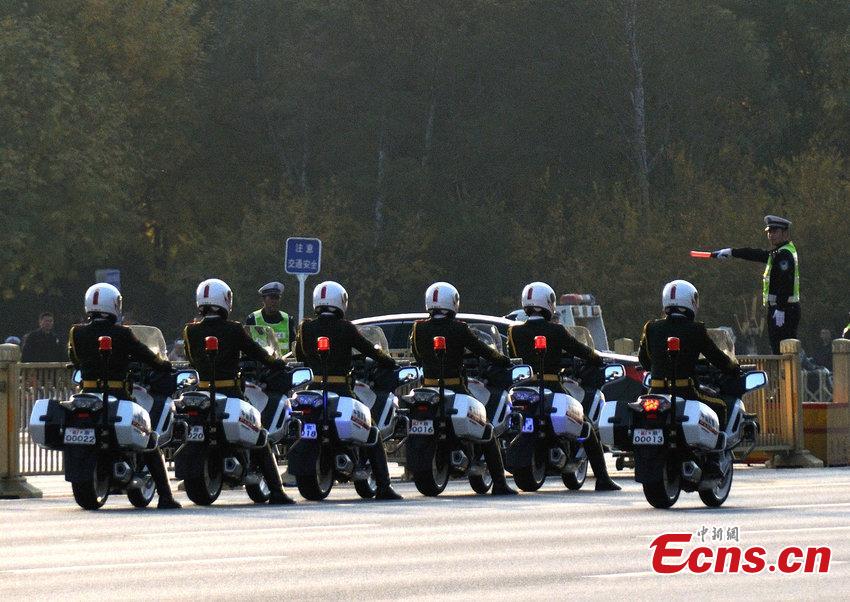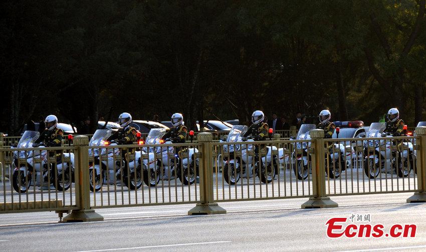 Photo taken on October 27, 2014 shows motorcycles escorting the motorcade of visiting Czech President Milos Zeman on Chang'an Avenue in Beijing, capital of China. China resumed motorcycle escorts for visiting foreign leaders on October 21. The protocol had been conducted since the founding of the People's Republic of China in 1949, but stopped on January 1, 2004. [Photo/ CFP]