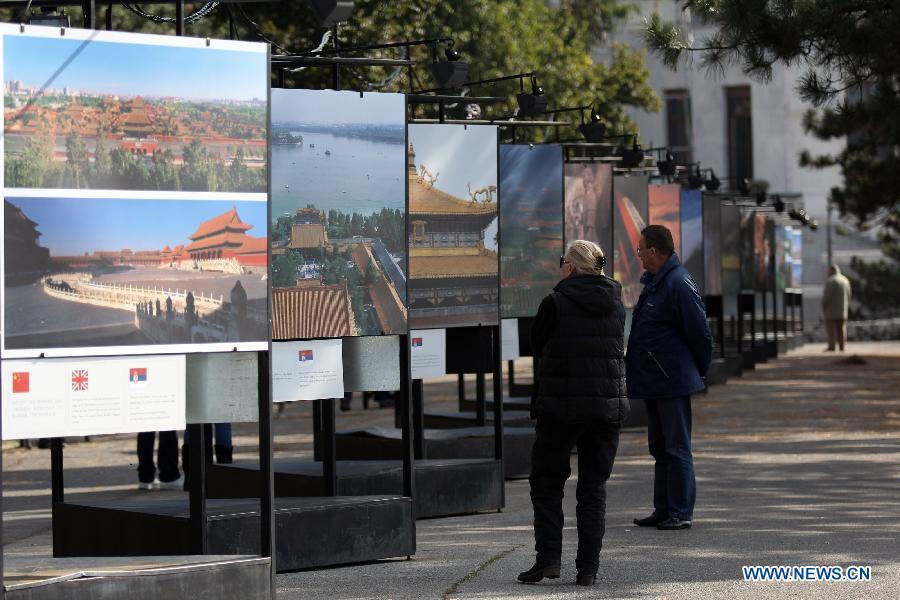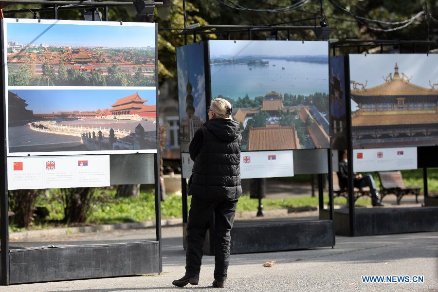 A man visits the "World Heritage in China" photo exhibition in Belgrade, Serbia, Oct 27, 2014. The "World Heritage in China" photo exhibition was held during the 59th Belgrade Book Fair which was opened on Oct 26. (Xinhua/Borislav Zdrinja)