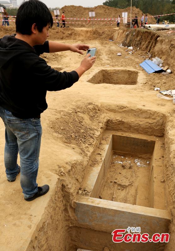 A man takes photos for ancient tombs unearthed at a construction site in Xinzheng, Central China’s Henan province on Monday, October 27, 2014. A total of 56 tombs were discovered by archaeologists from the city’s cultural relics bureau. Experts said those ancient tombs belonged to the late Warring States Period (475-221 BC). [Photo: China News Service/ Yang Zhenghua]