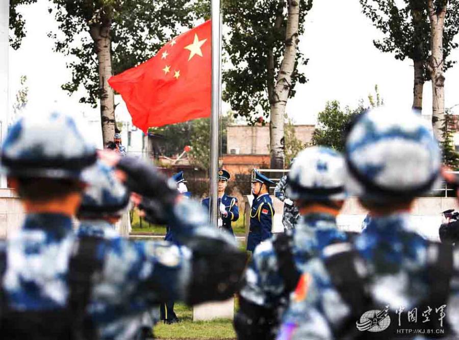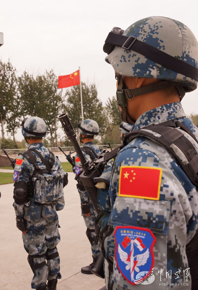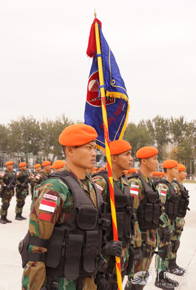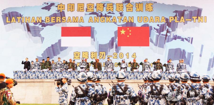 Chinese airborne soldiers participate in the opening ceremony of the training. The airborne troops of China and Indonesia kicked off a joint anti-terrorism drill code-named "Sharp Knife Airborne - 2014" in China on October 27. (81.cn/Gao Fuxi)