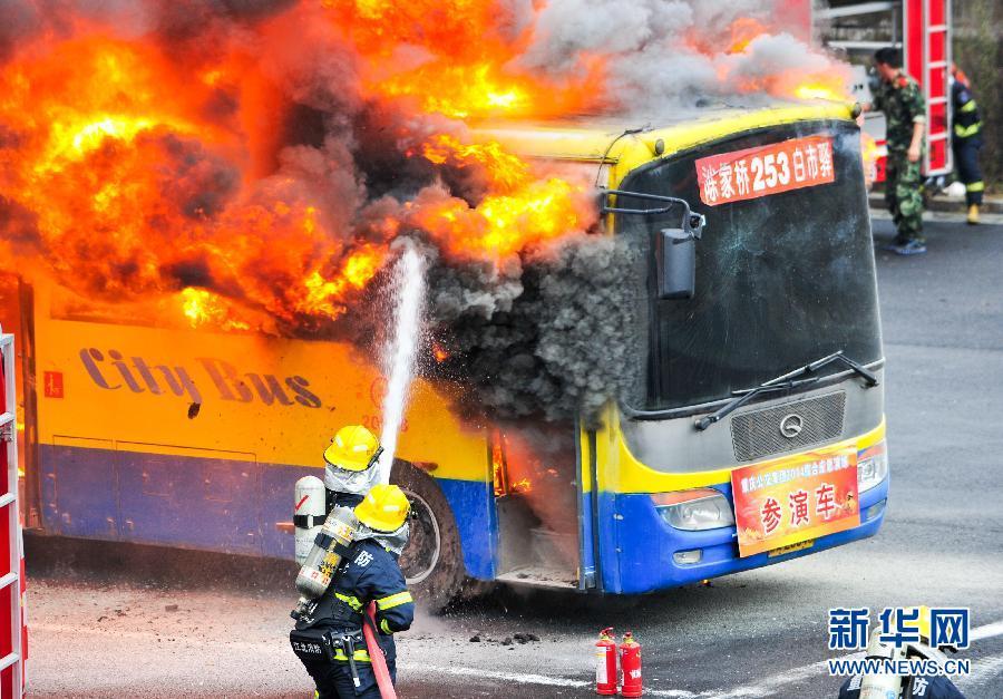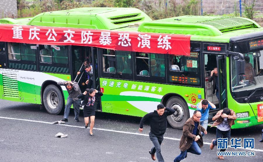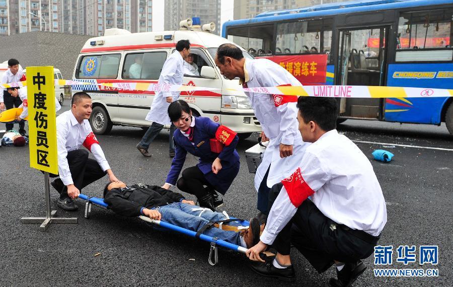 Over 500 drivers and conductors of Chongqing's public transport system participated in the comprehensive emergency drill in southwest China's Chongqing, on Oct 28, 2014. This drill aims at enhancing the overall capability of the whole system to handle emergency . (Source: Xinhua photo)