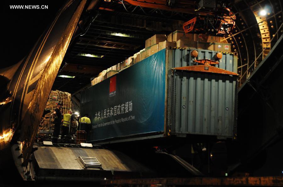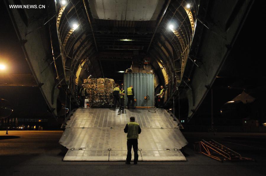 Crew members and Ghanaian workers unload anti-Ebola materials, including Personal Protection Equipment (PPEs), sprayers, body temperature detectors and body bags, aided by the Chinese government at Kotoka International Airport of Accra, the capital of Ghana, in the midnight of Oct 29, 2014. (Xinhua/Lin Xiaowei)