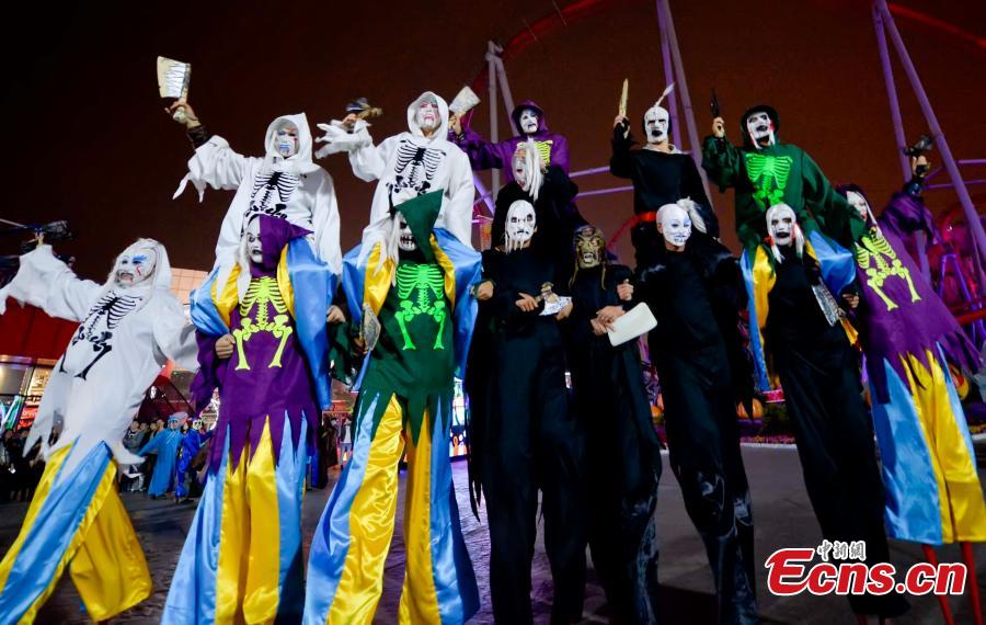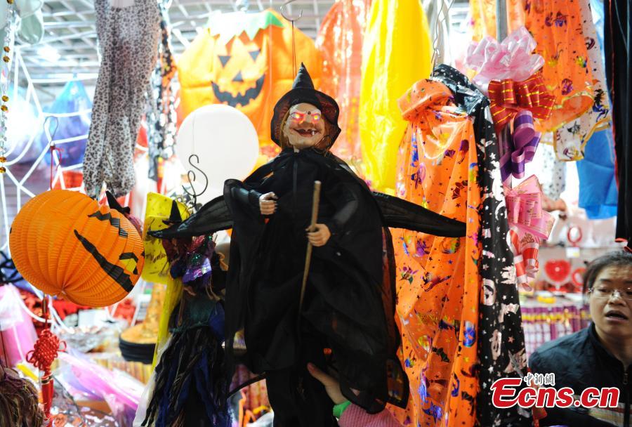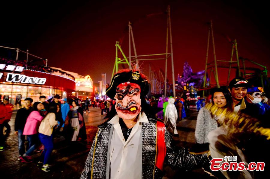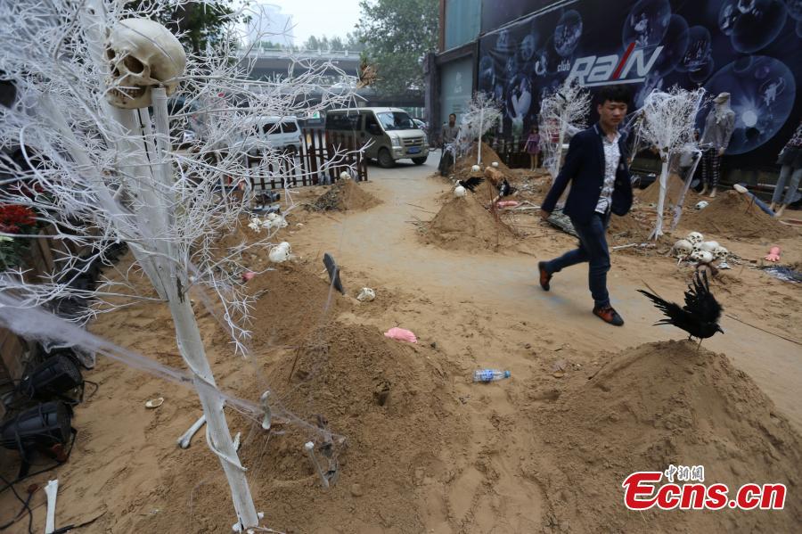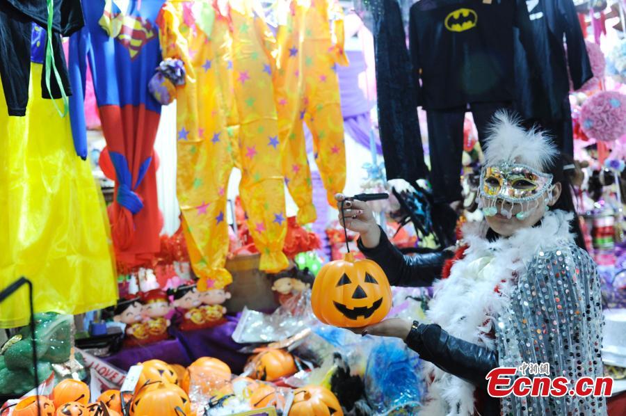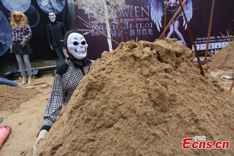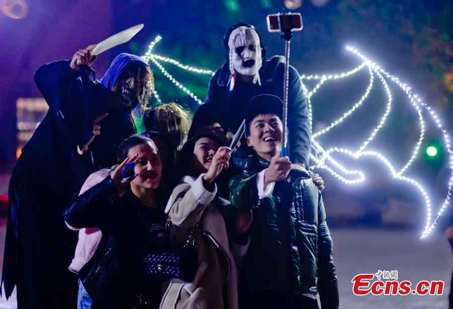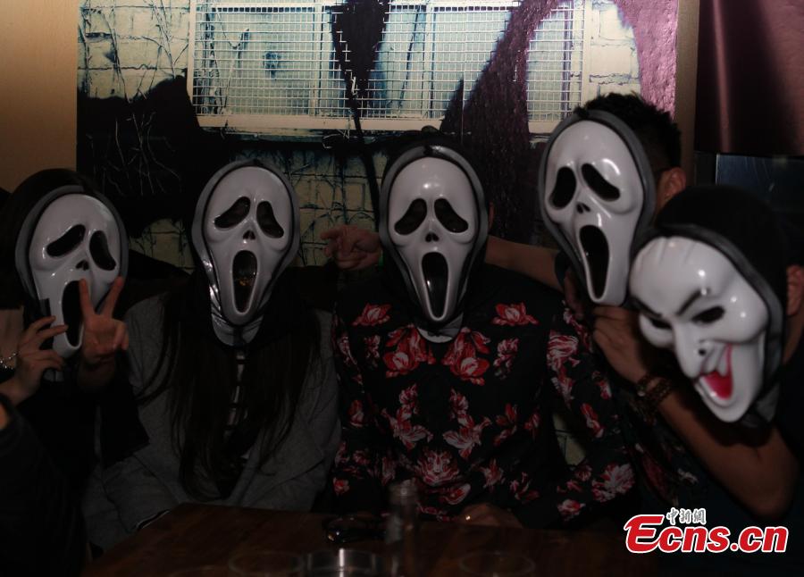 Young women wearing scary make-up pose for selfie at a Halloween party in Chongqing on October 30, 2014. Halloween is becoming the third-biggest imported festival after Christmas and Valentine's Day in China. As the festival approaches, lots of malls and theme parks have taken the card of "ghost". All kinds of scary designs and various pumpkin shapes have pushed the festival atmosphere to its prime. [Photo: China News Service / Zhou Yi]