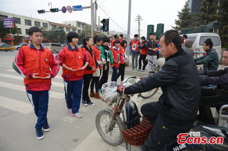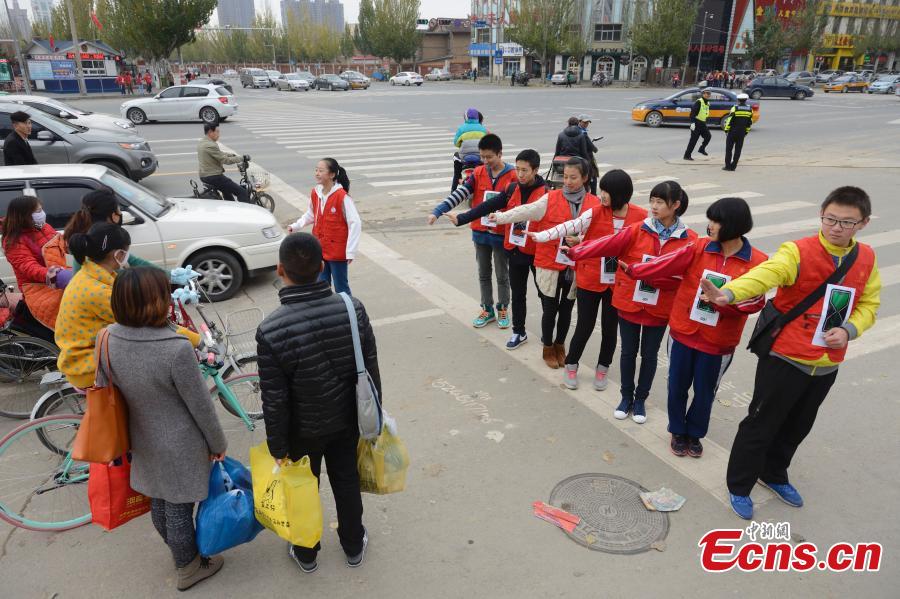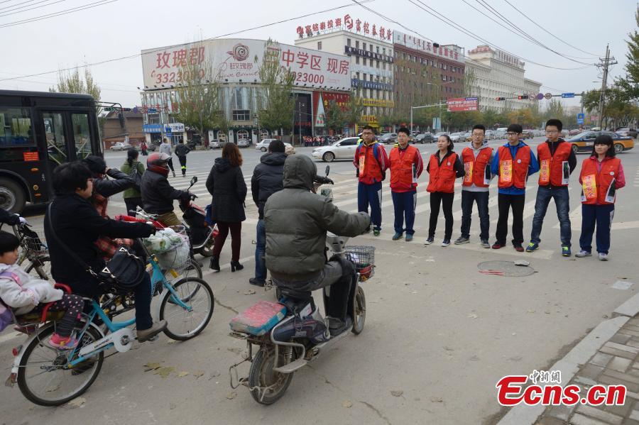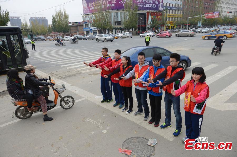 Students stand in a line in front of a stop sign of a bicycle line to prevent passengers from running red lights in Hohhot, capital of North China's Inner Mongolia Autonomous Region on October 11, 2014. The activity was initiated by a local middle school to stop the "Chinese-style road crossing," a phenomenon that refers to large crowds of Chinese people crossing roads, no matter whether the traffic light is green or red.[Photo: China News Service/ Liu Wenhua]