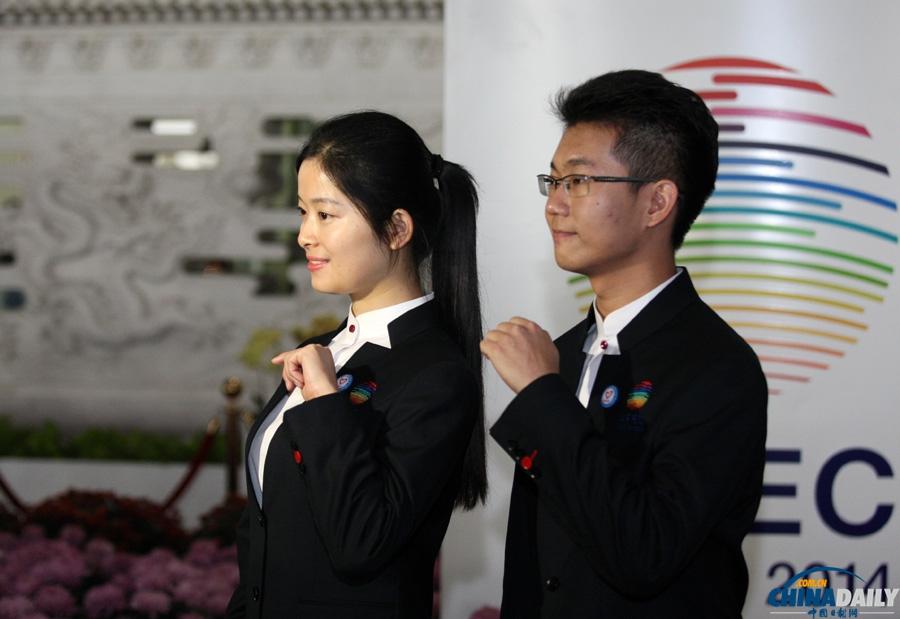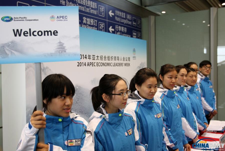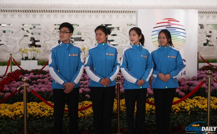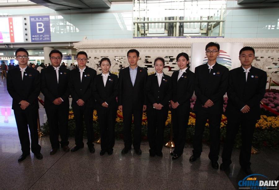 Volunteers wearing new uniforms at the Beijing Capital International Airport are ready for APEC meetings in Beijing, China, Nov 1, 2014. The APEC Economic Leaders' Meeting will be held in Beijing from Nov 10 to 11.[Photo/China Daily]