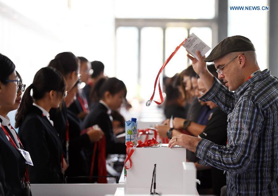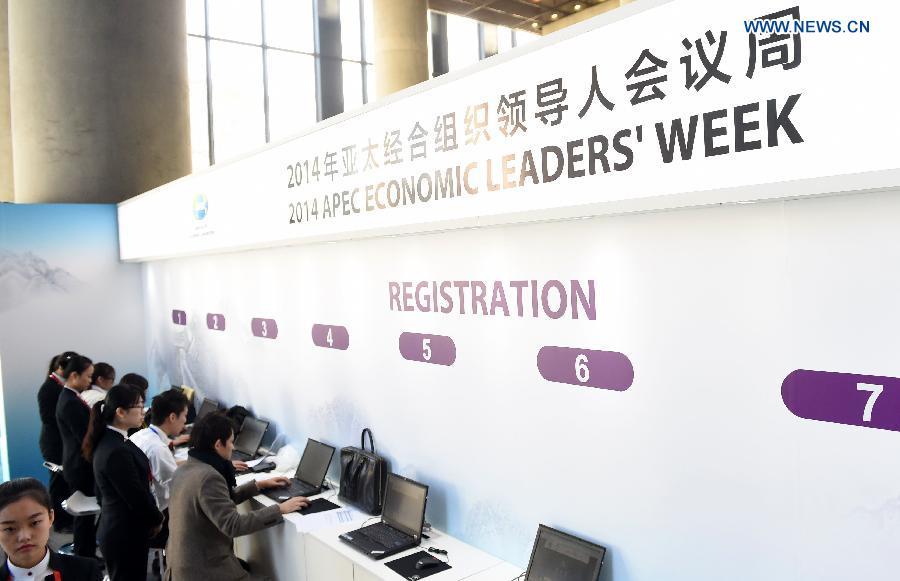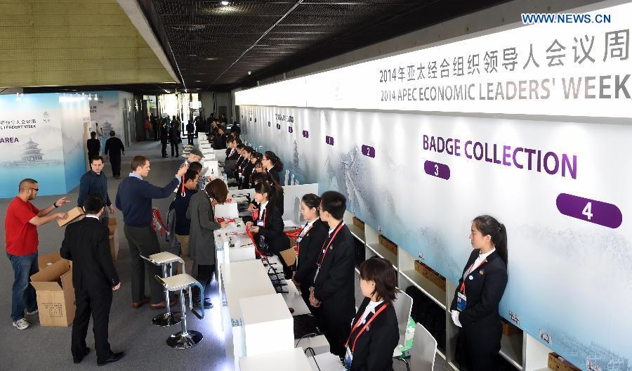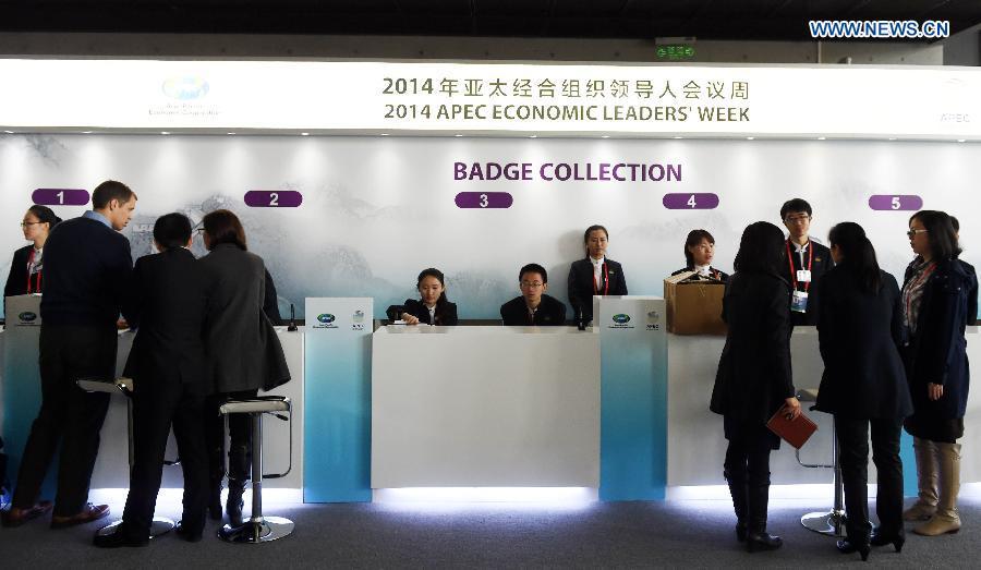 A participant receives his badge at the registration center for the 2014 APEC Economic Leaders' Week in Beijing, China, Nov 3, 2014. The registration center for the APEC meeting in Beijing was officially opened on Monday, providing reception service running from 8:00 am to 6:00 pm (Xinhua/Chen Yehua)