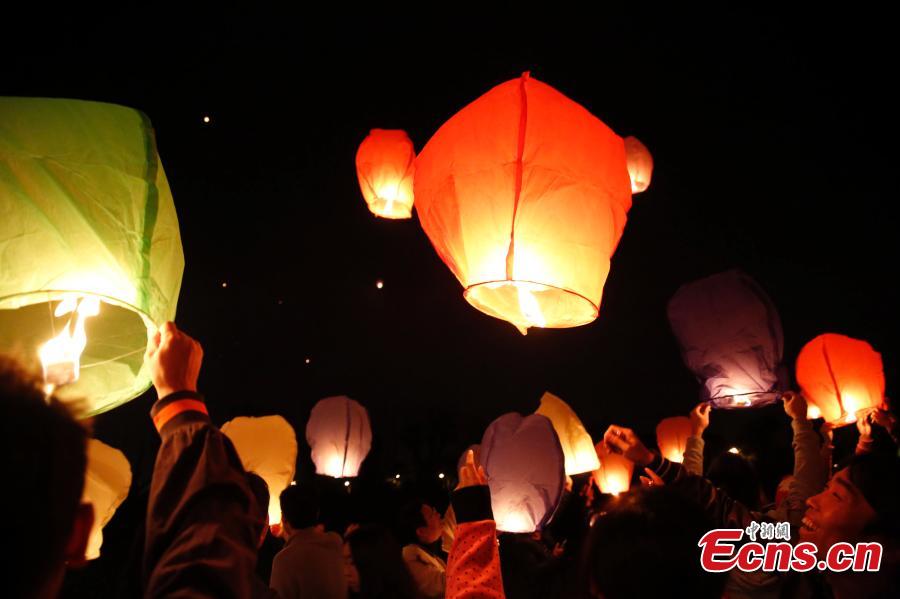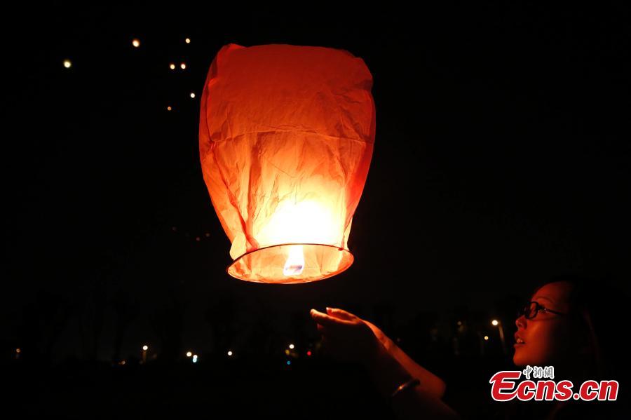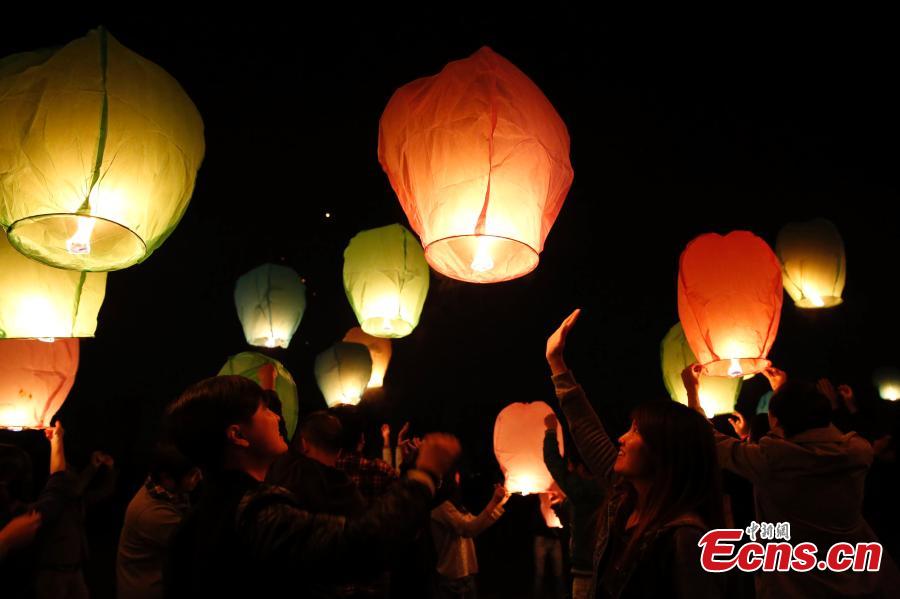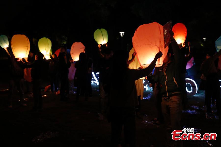 A girl sends up a Kongming lantern, as a way to send skyward her wish of meeting the Mr. Right during an activity in Shanghai on Monday evening, November 3, 2014. The event has attracted several 'leftover' men and women who wanted to say goodbye to their single life. [Photo: China News Service/ Tang Yanjun]