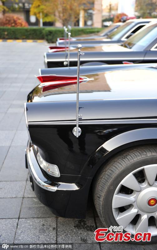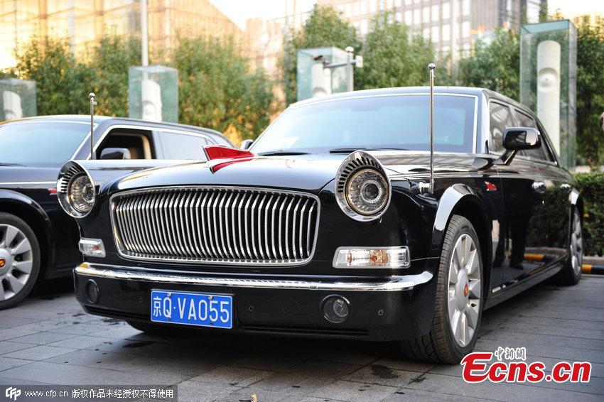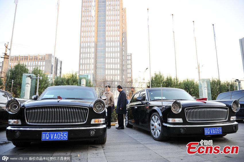 Three Hongqi (red flag) L5 limousines are seen parked outside a hotel in Beijing on November 4, 2014. The high-end cars will be used to receive foreign guests during the upcoming APEC. Each of the luxury cars is priced at six million yuan ($ 979,831). [Photo/ CFP]