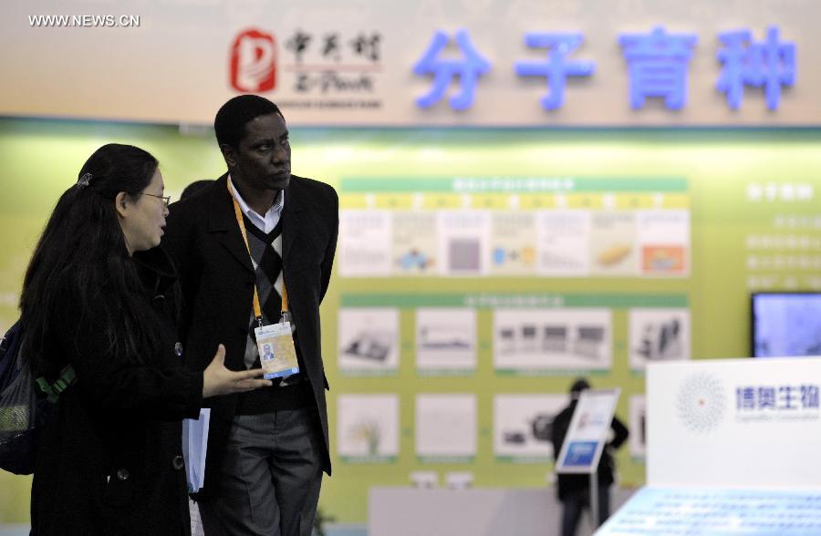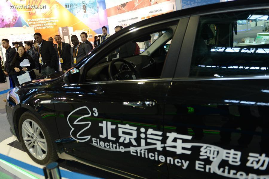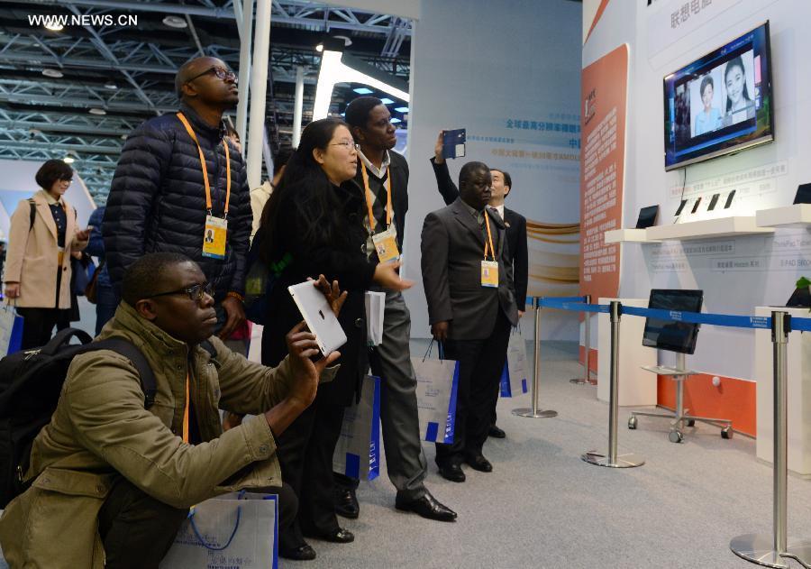 A foreign journalist (R) visits the Zhongguancun Exhibition Center at the Zhongguancun Science Park in Beijing, capital of China, Nov 6, 2014. Media reporters covering the 2014 Asia-Pacific Economic Cooperation (APEC) Economic Leaders' Week attended a peripheral group interview on technology and innovation Thursday in Beijing, during which they visited the Zhongguancun Science Park and the ZPark, a national software base. (Xinhua/Ma Ning)