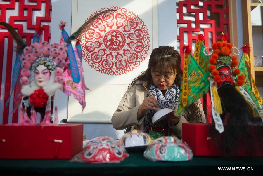 A pair of handmade fabric shoes are exhibited during the exhibition "This is Beijing" inside China National Convention Center, a venue of the 2014 Asia-Pacific Economic Cooperation (APEC) Economic Leaders' Week, in Beijing, capital of China, Nov 7, 2014. The exhibition "This is Beijing" displays the culture, tradition and scientific innovation of China's capital city. (Xinhua/Luo Xiaoguang)