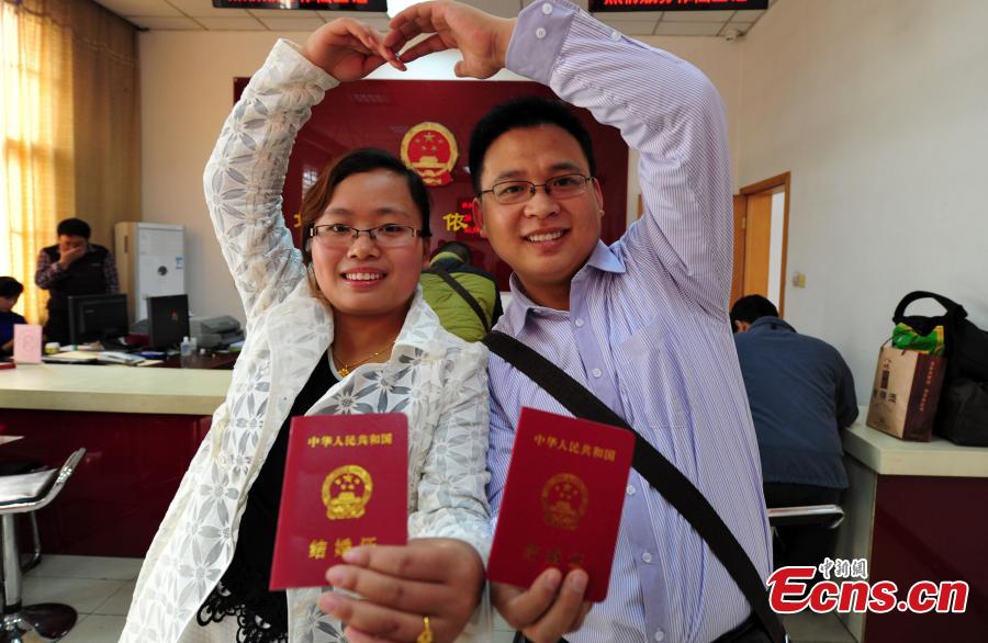 A couple share a romantic moment after signing their marriage certificates in Taiyuan, Shanxi province on Tuesday, Nov 11, 2014. Nov 11 has been known as Singles' Day since the 1990s and is a time when many people say farewell to single life. (Photo: China News Service / Wu Junjie)