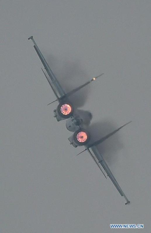 A Sukhoi SU-35 fighter jet performs a test flight ahead of the 10th China International Aviation and Aerospace Exhibition in Zhuhai, south China's Guangdong Province, Nov. 10, 2014. Some 700 exhibitors at home and abroad with 130-plus planes will attend the six-day airshow from November 11 to 16. (Xinhua/Liu Dawei)