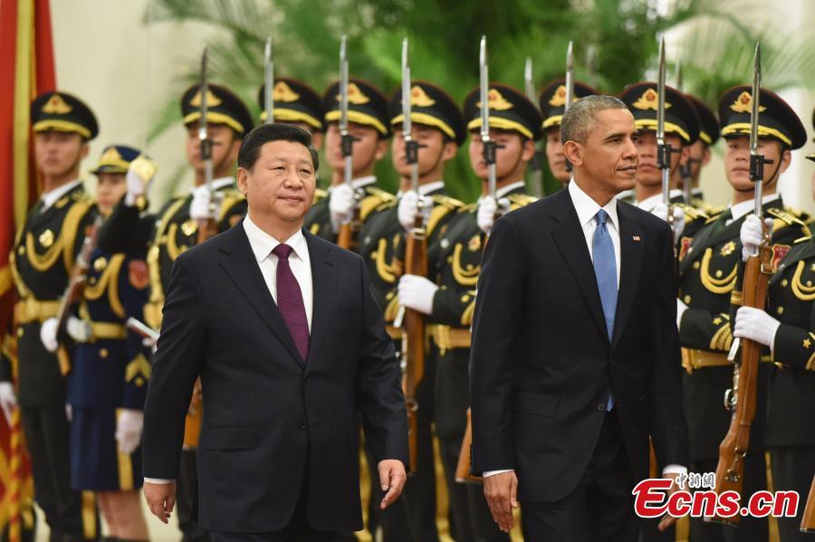 Chinese President Xi Jinping (R) holds a red-carpet ceremony to welcome his US counterpart Barack Obama at the Great Hall of the People in Beijing on Wednesday, Nov 12, 2014. (Photo: China News Service/Du Yang)