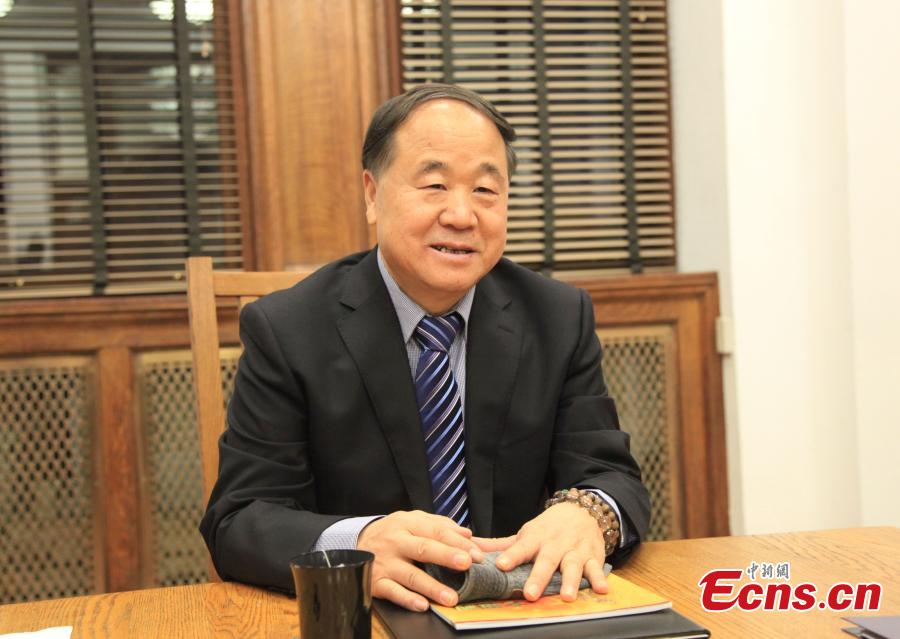 Chinese writer and Nobel laureate Mo Yan (R) delivers a speech after receiving an honorary degree from the City University of New York in US on Monday evening, November 10, 2014. His lecture in the Great Hall of the university, entitled "My Story," was entirely in Mandarin Chinese with simultaneous translation in English. [Photo: China News Service/ Ruan Yulin]