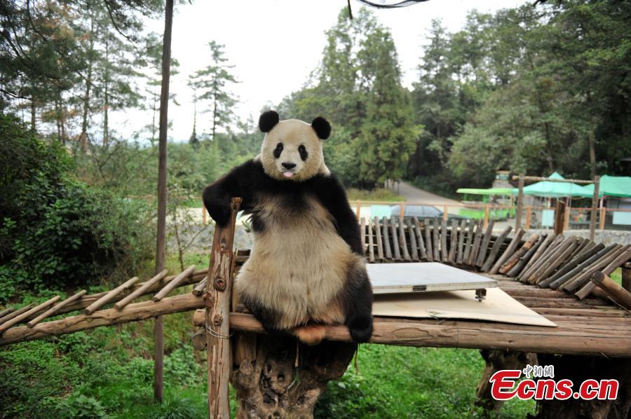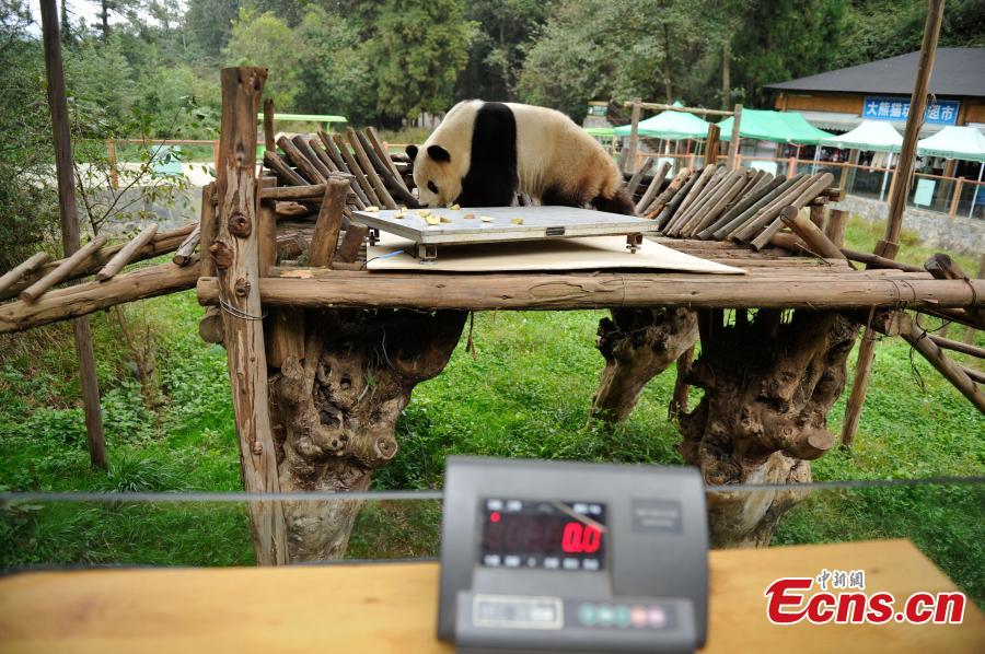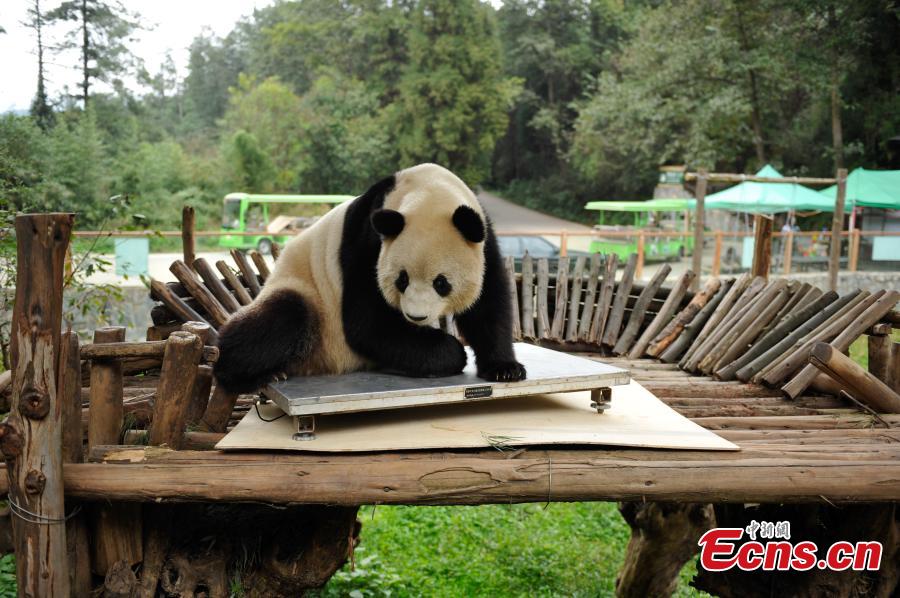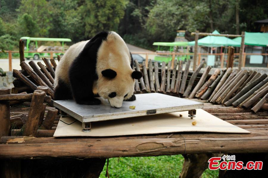 Panda Sijia sits on a weighing machine broken by herself at the Yunnan Wild Animal Park in Kunming, Yunnan province on November 13, 2014. Sijia bit off the electric wire of the machine to refuse a medical examination. [Photo: China News Service/ Liu Ranyang]