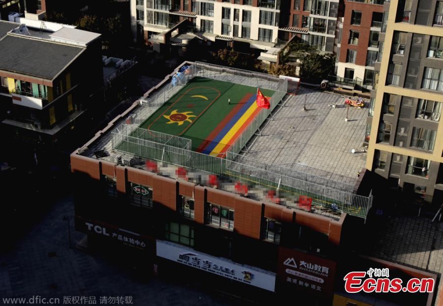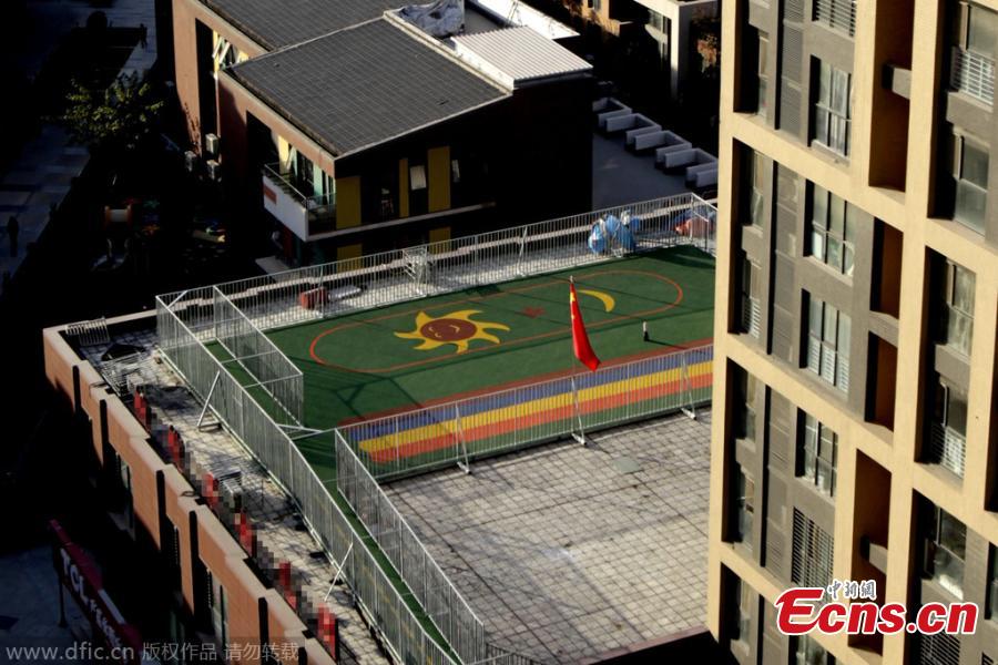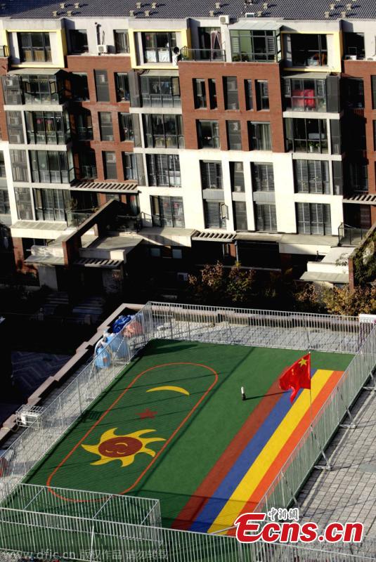 Photo taken on November 14, 2014 shows a rooftop sports field with guardrails in urban Zhengzhou city of Henan province. A private kindergarten built it due to a lack of available land for sports, but it has aroused complaints from the community’s residents. [Photo/IC]
