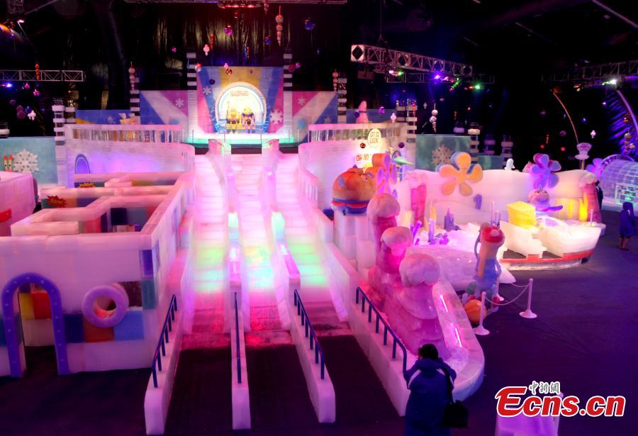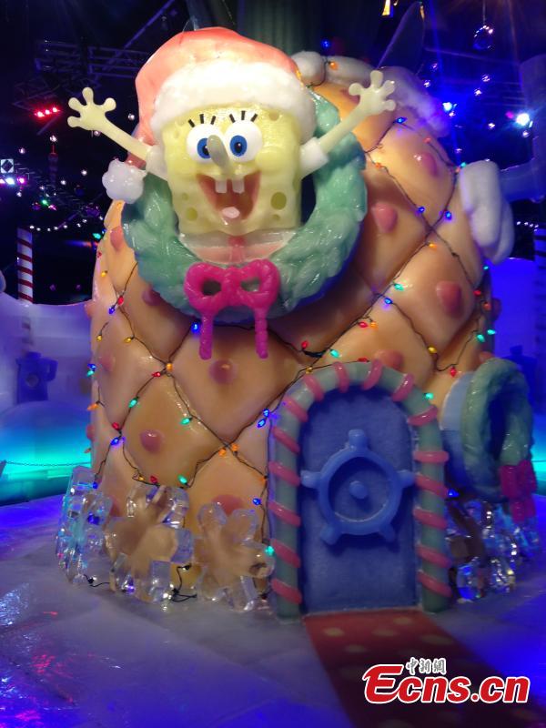 Ice sculptures resembling Bikini Bottom, the underwater home for SpongeBob and his friends, are seen at an ice sculpture show in the Moody Garden of Texas, US on November 14, 2014. A skilled team of 31 internationally-acclaimed professional ice carvers from China’s Harbin dove into 900 tons of ice and transformed them into majestic marvels featuring holiday scenes with the beloved Bikini Bottom inhabitants from Nickelodeon’s SpongeBob SquarePants. The event kicked off on November 15, and would last until next January. [Photo: China News Service/ Wang Huan]