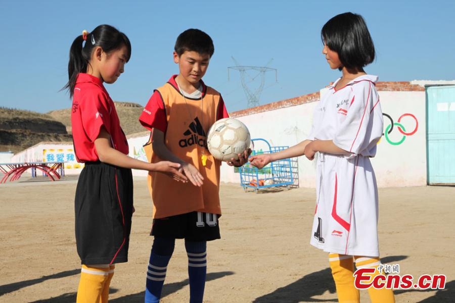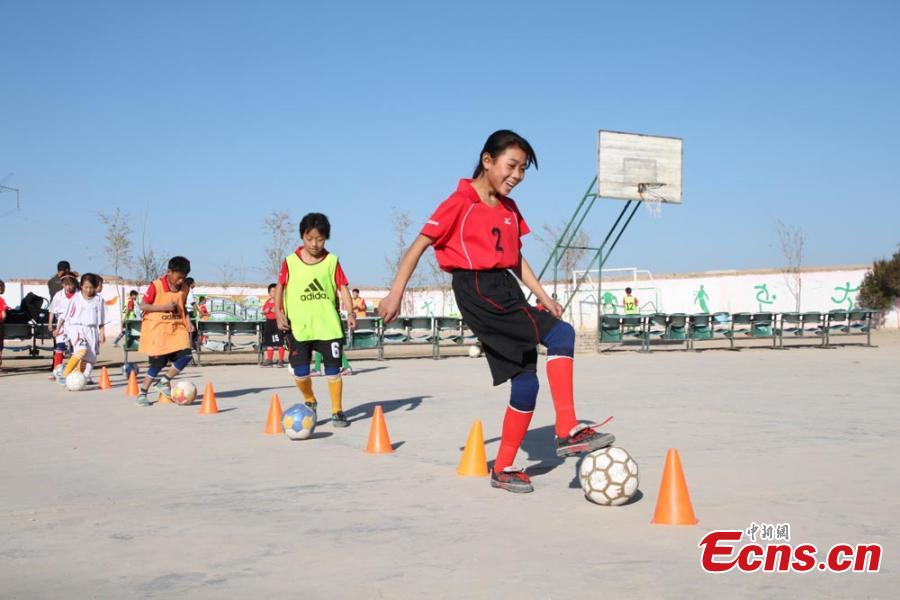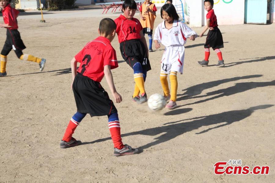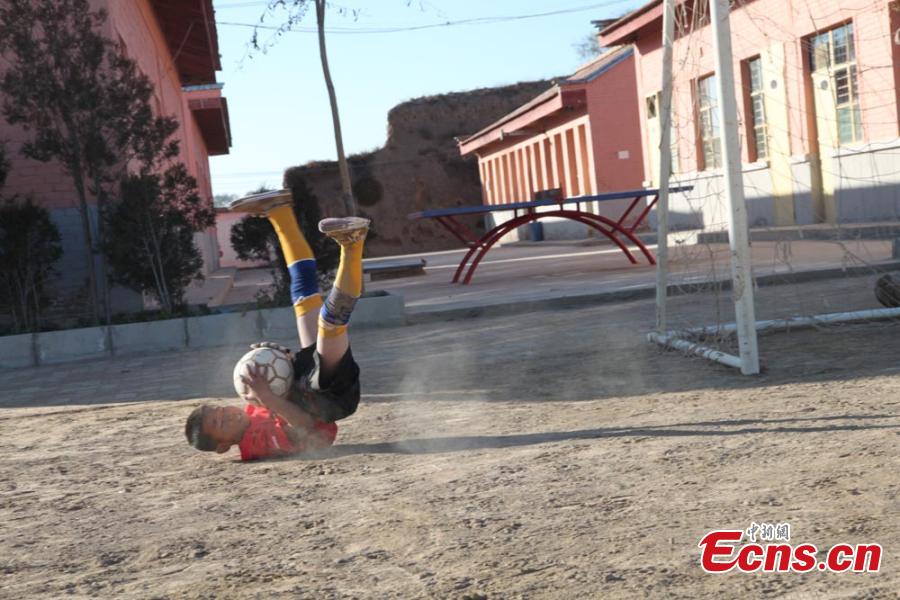 Students play football on a playground of a rural primary school in Yuzhong county, Gansu province on November 14, 2014. Located in remote mountain area, the school with poor sports facilities features an awesome football team. Several outstanding young players of the school have been selected by the Evergrande Football School to receive comprehensive training in the past years. [Photo/ Liu Yutao]