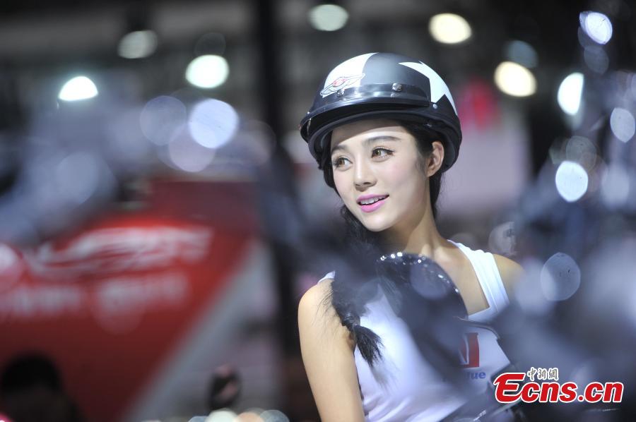 A hot girl draws crowds at a motor show held in southwest China’s Chongqing on November 15, 2014. [Photo: China News Service / Chen Chao]
