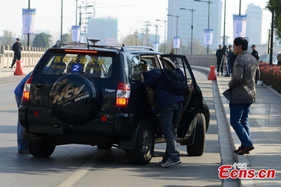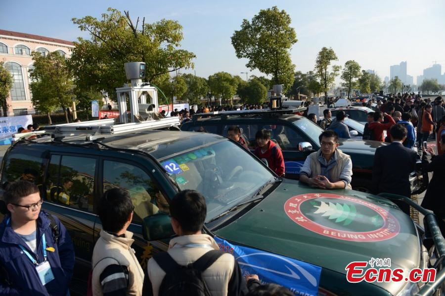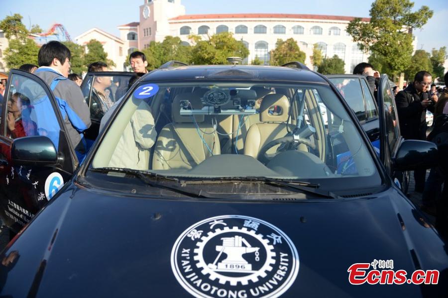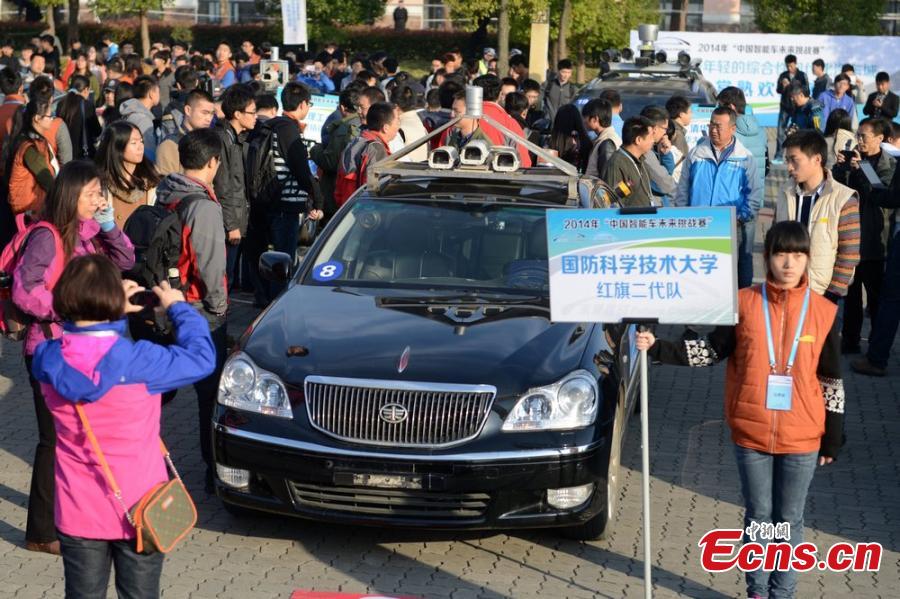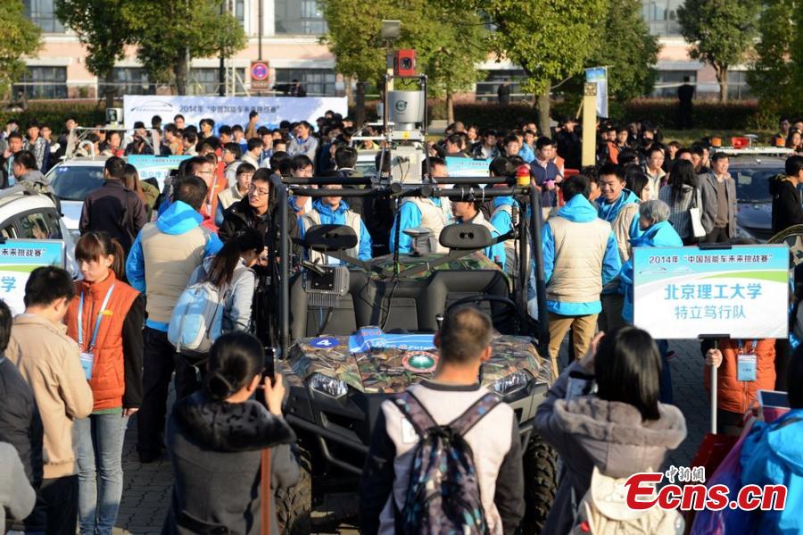 Photo taken on November 15, 2014 shows a self-driving car in an unmanned vehicle contest in Changshu of Jiangsu province. Altogether 22 cars from China’s universities and research institutions will compete with each other in the Future Challenge 2014 contest, which started on Saturday. [Photo/ Wang Sizhe]